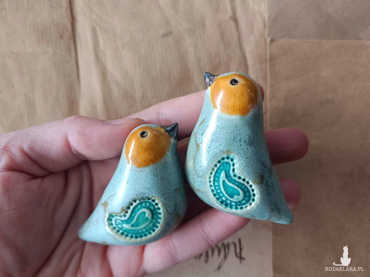 Ptaszki ceramiczne w kolorze seledynowym o wymiarach ok 5,5 cm x 4,5 cm wykonane z gliny szamotowej, wypalone na biskwit, a następnie szkliwione w temp ok 1260 stopni C. Polecam serdecznie.