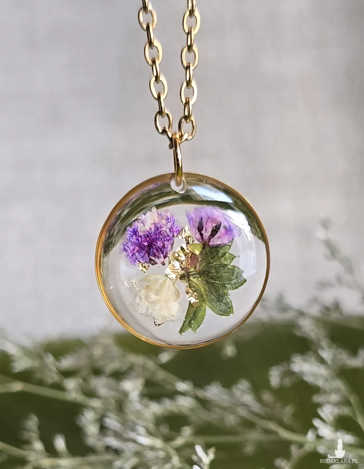 Oferuję Państwu unikalną biżuterię. Zawieszka jest wykonana z suszonych kwiatów i żywicy epoksydowej. Biżuteria jest wspaniałym i oryginalnym prezentem na lata.