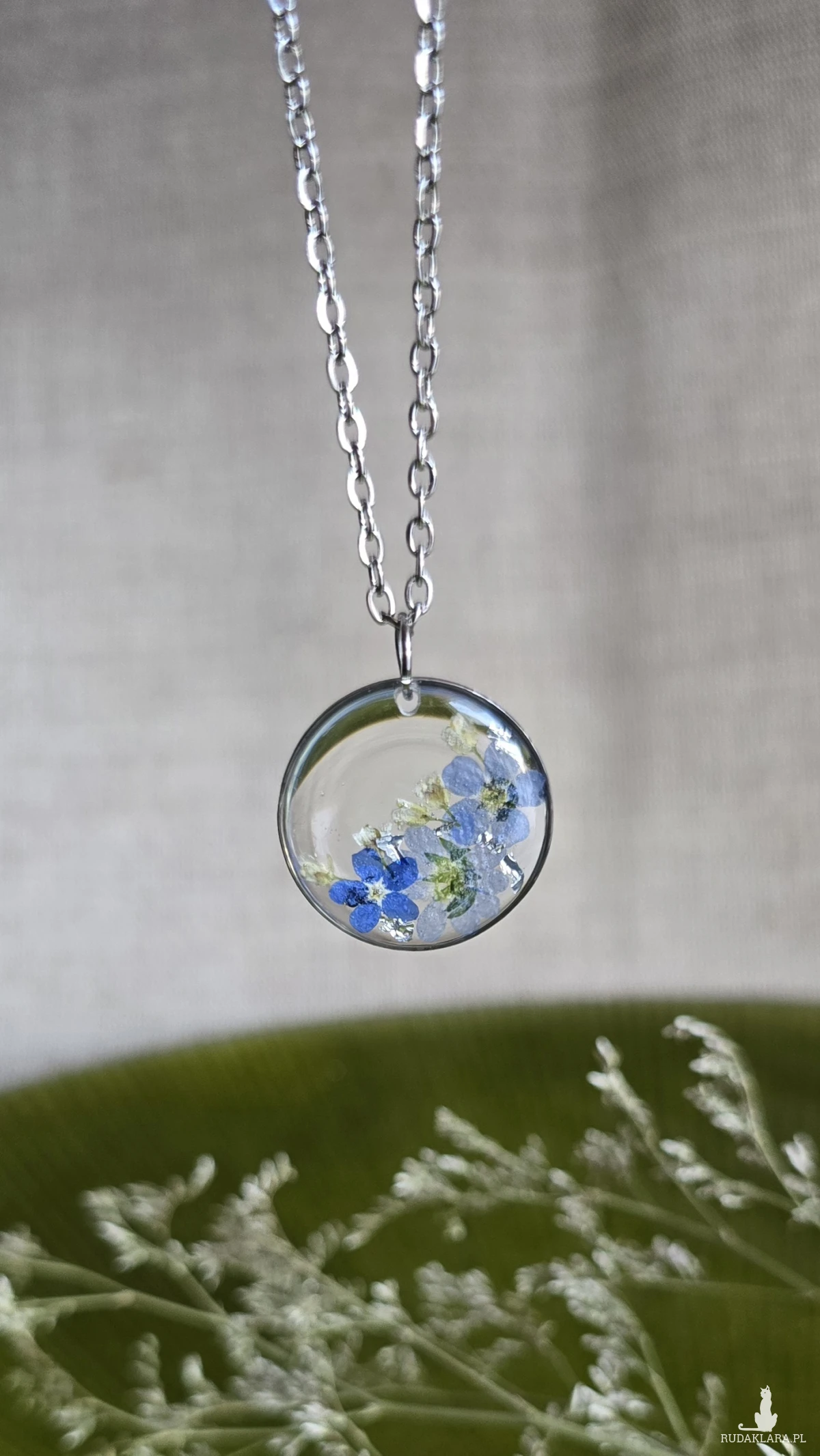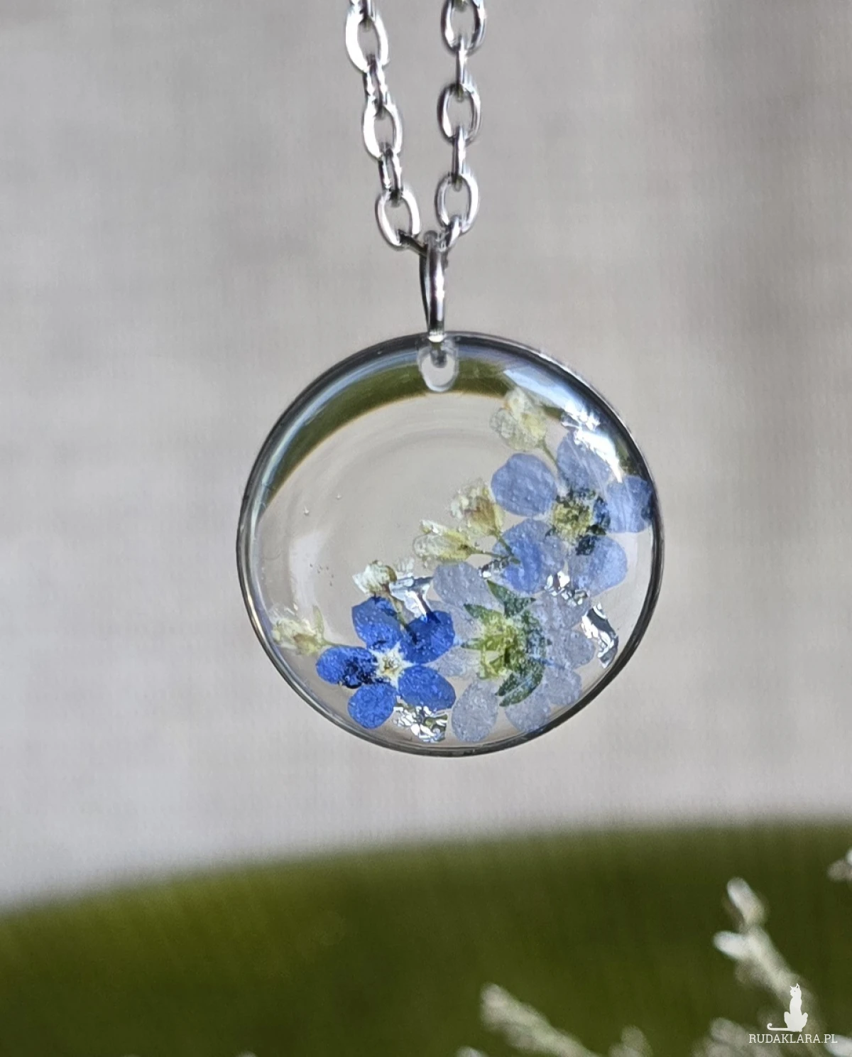Oferuję Państwu unikalną biżuterię. Zawieszka jest wykonana z suszonych kwiatów i żywicy epoksydowej. Biżuteria jest wspaniałym i oryginalnym prezentem na lata.