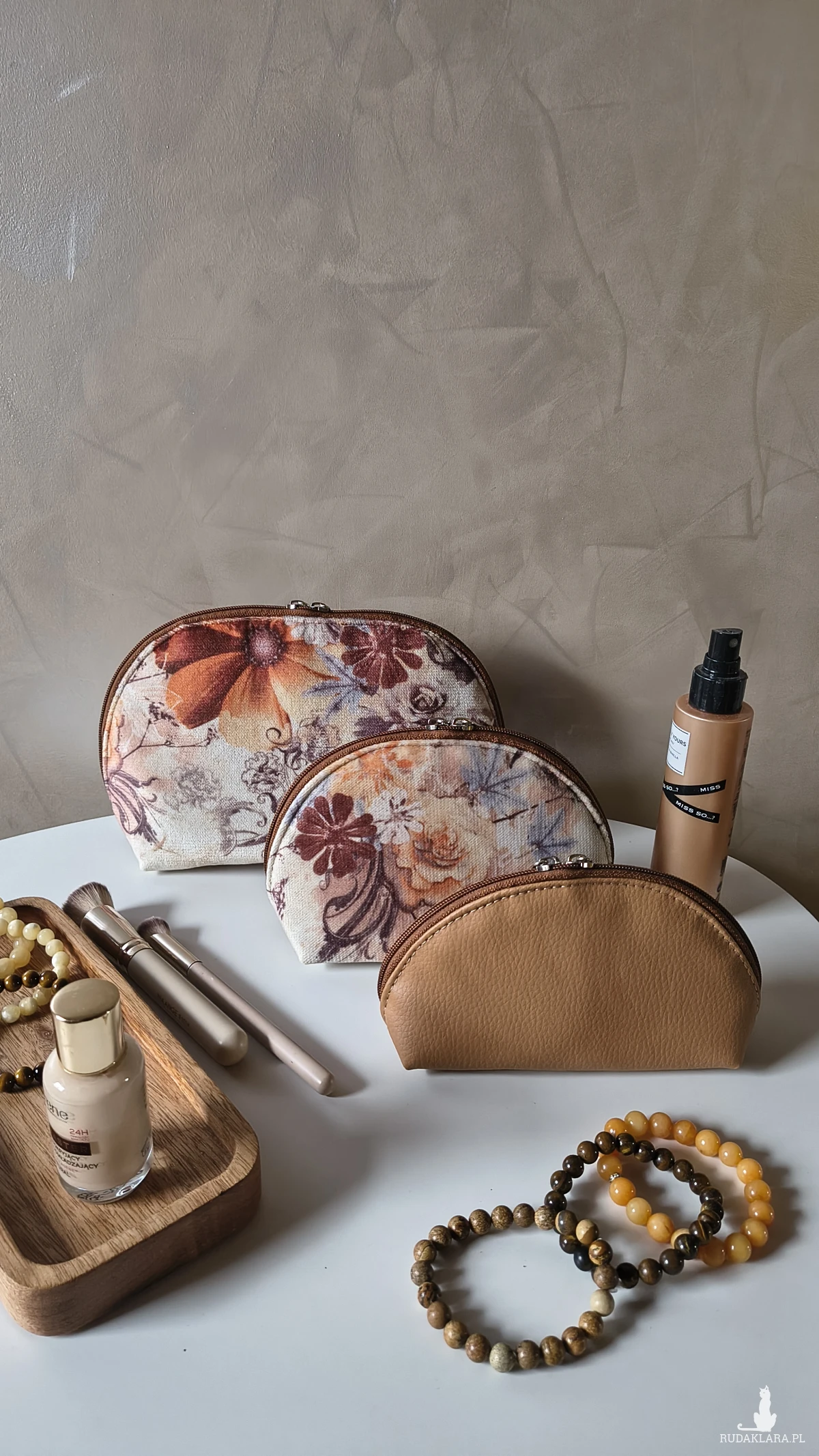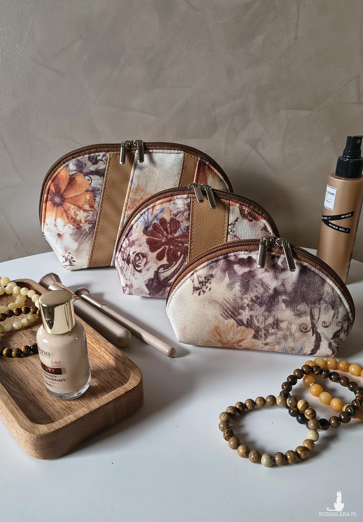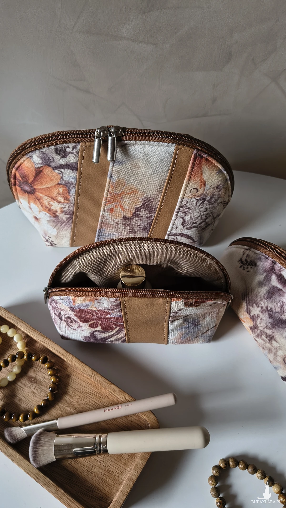 Każda kosmetyczka powstaje ręcznie, z dbałością o trwałość i estetykę. Starannie dobrane materiały, solidne wykończenia i unikatowy wzór sprawiają, że to zestaw, który zostaje na lata.
