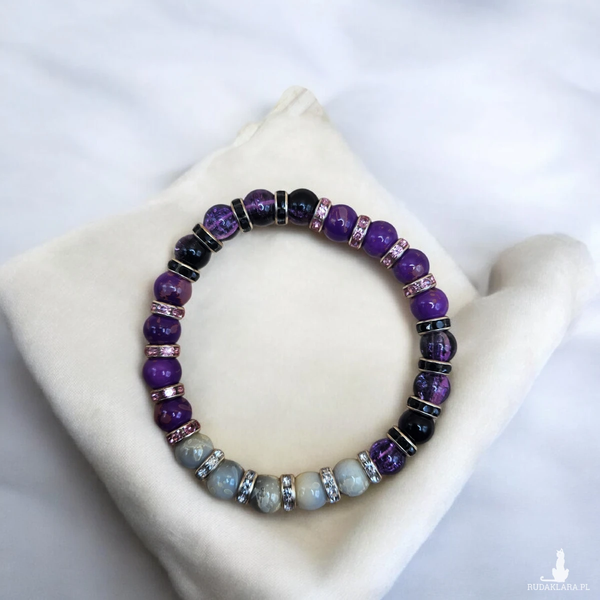 Elegancka bransoletka wykonana z okrągłych koralików w odcieniach fioletu, czerni i szarości. Centralną część zdobią jasnoszare koraliki o delikatnym, marmurkowym wzorze, oddzielone błyszczącymi przekładkami z kryształowym efektem. Całość tworzy spójną i stylową kompozycję, idealną zarówno na co dzień, jak i na specjalne okazje.