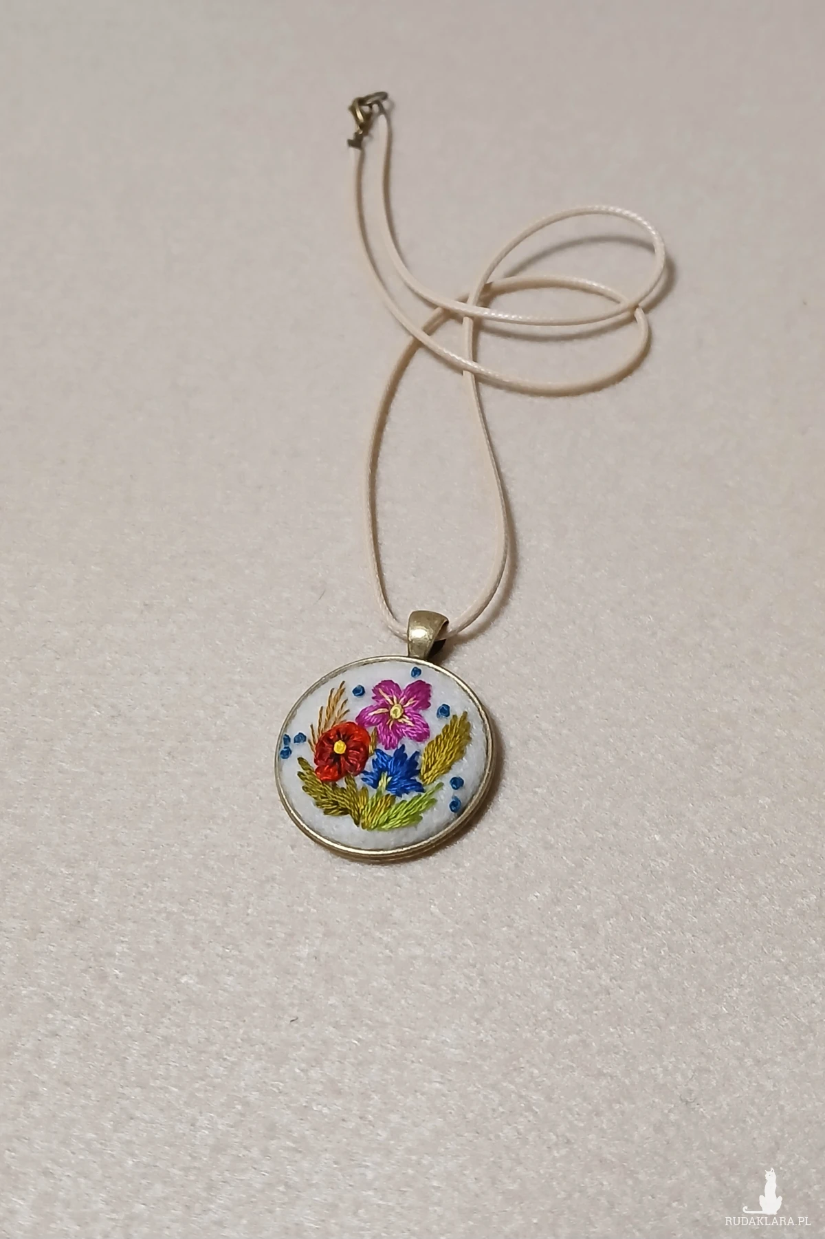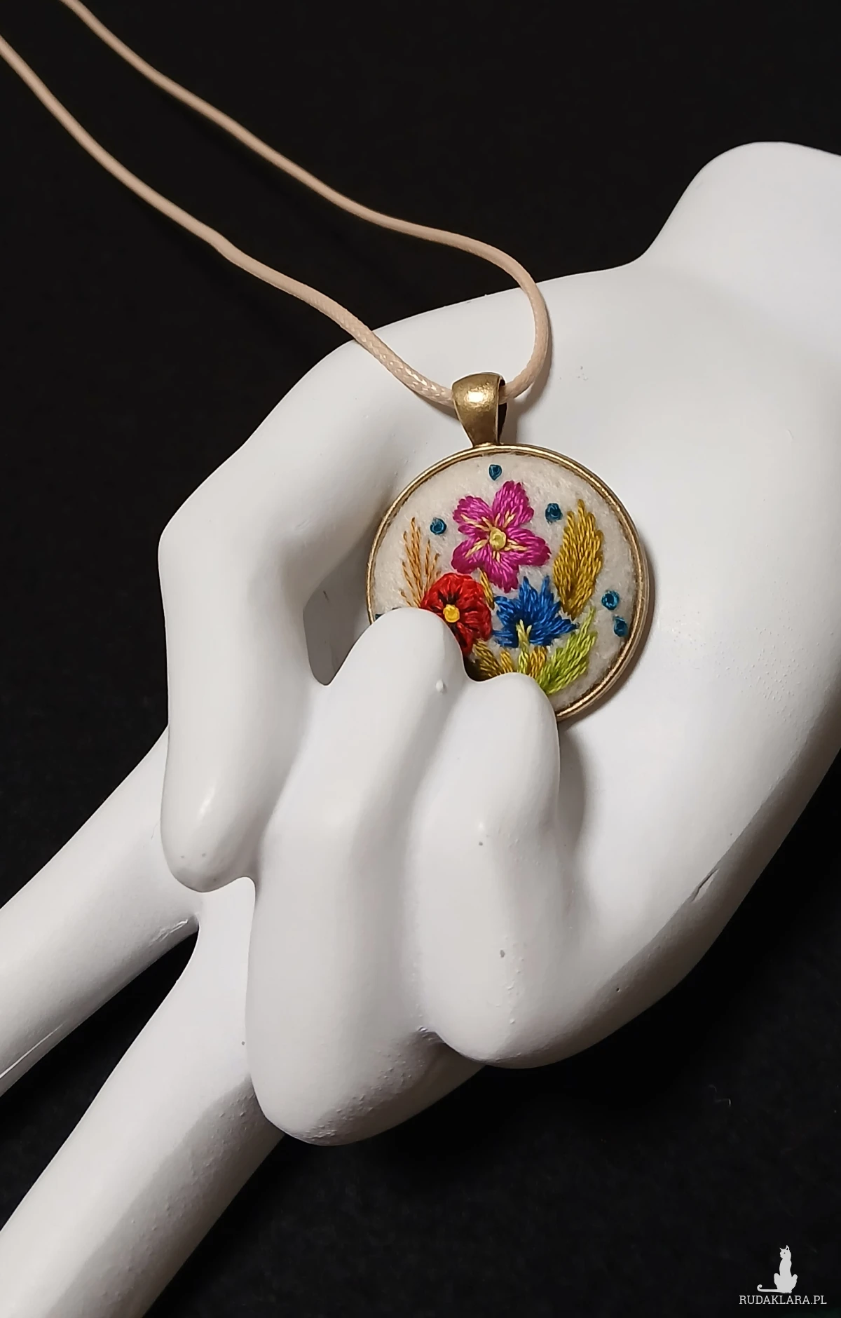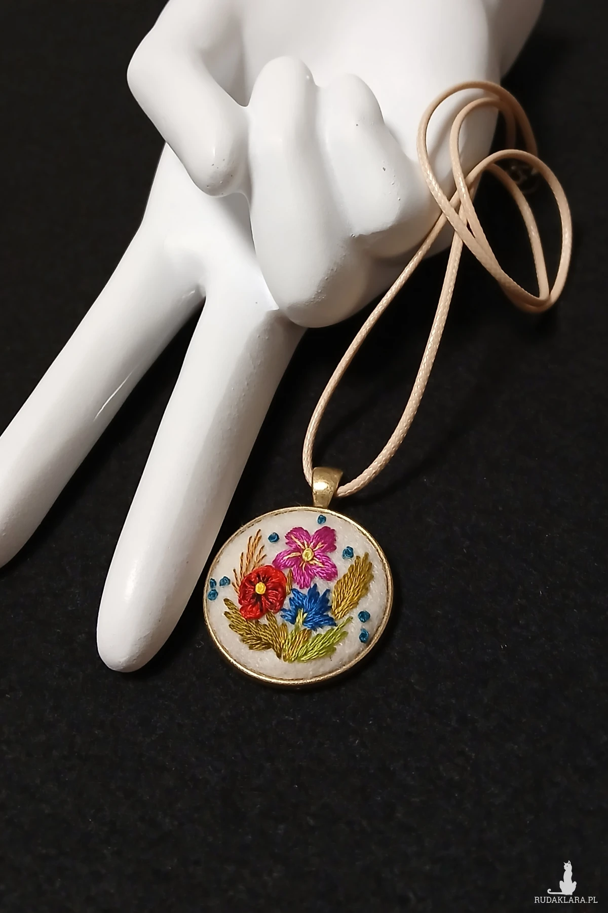 Dopadła Cię tęsknota za latem? Dodaj do swojej kreacji letni wisior z kolorowym bukietem polnych kwiatów na jasnym tle i pomyśl że zima wcale nie jest taka zła.