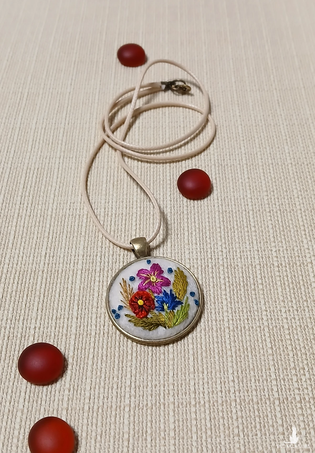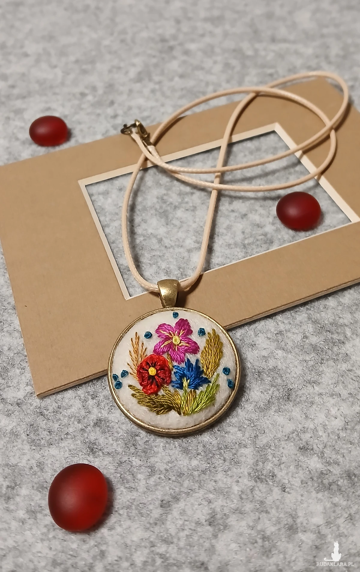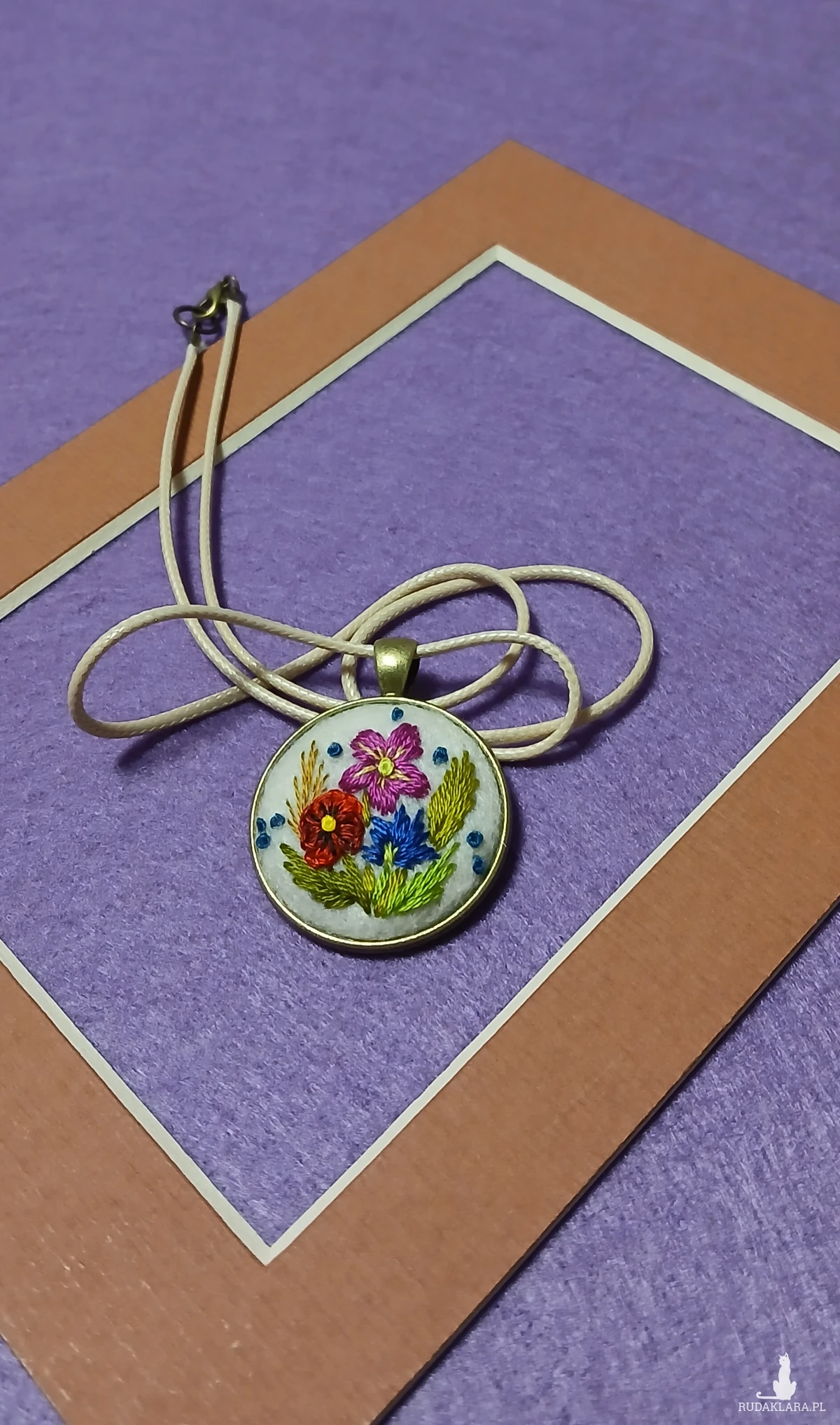 Dopadła Cię tęsknota za latem? Dodaj do swojej kreacji letni wisior z kolorowym bukietem polnych kwiatów na jasnym tle i pomyśl że zima wcale nie jest taka zła.