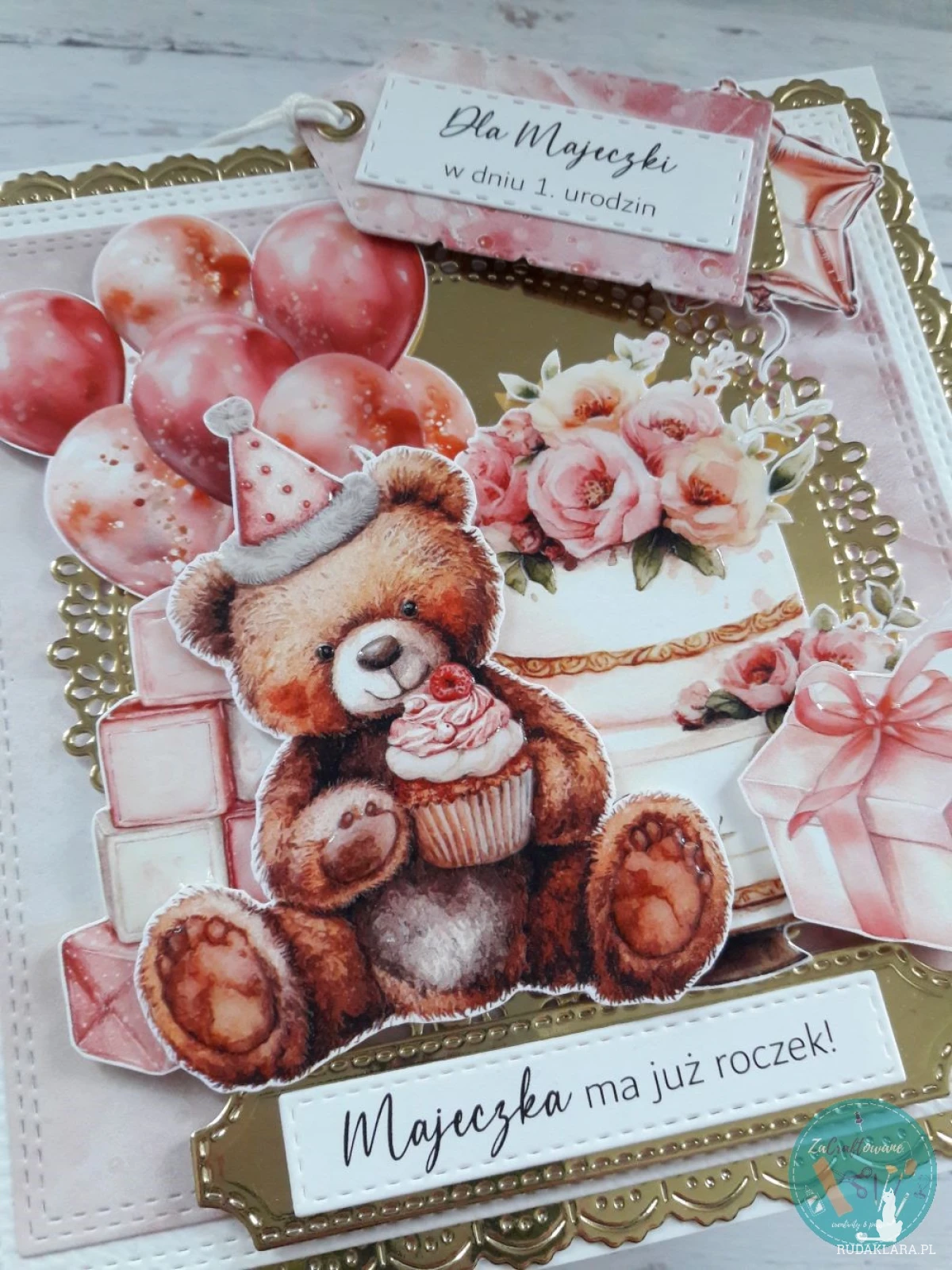 Motywem przewodnim kartki jest uroczy miś w otoczeniu balonów, klocków i tortu, który tylko czeka na świętowanie 1. urodzin razem z Małą Solenizantką. Kartka będzie idealnym dopełnieniem prezentu na roczek oraz piękną pamiątką tego wyjątkowego dnia.