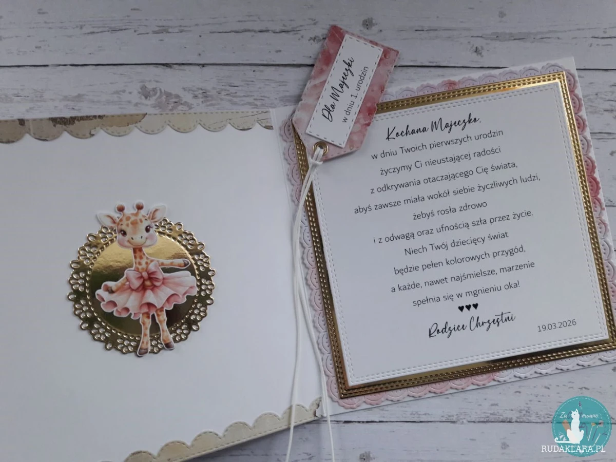 Warstwowa kartka z okazji pierwszych urodzin dla dziewczynki z efektem 3D wykonana metodą scrapbookingu i z dbałością o każdy szczegół.
