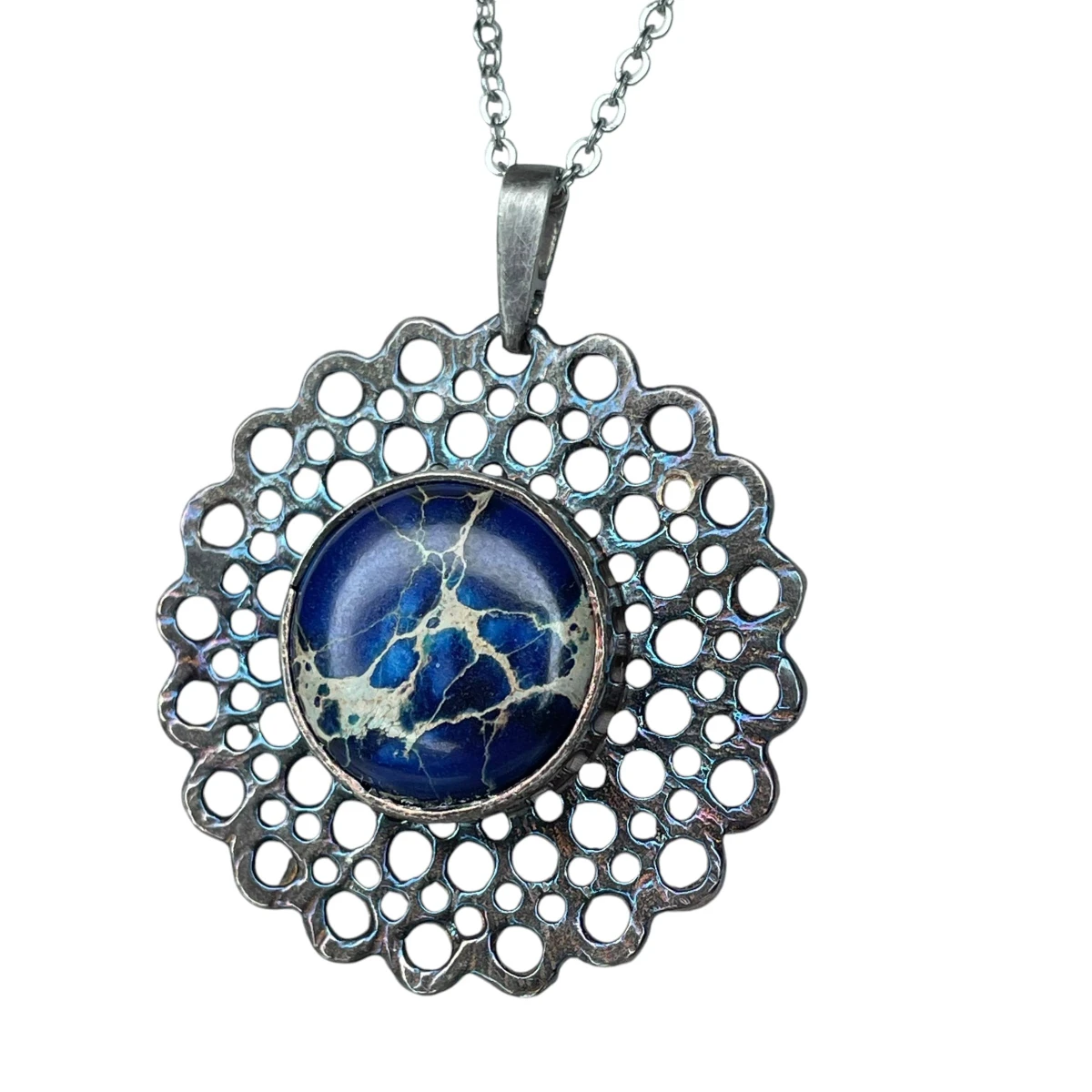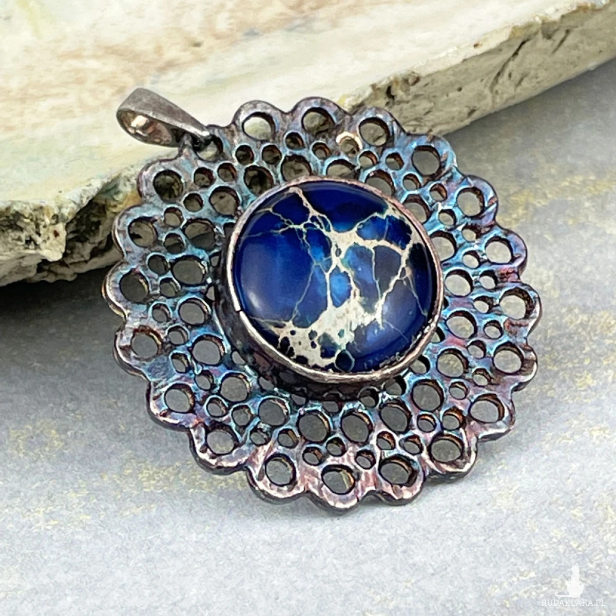 Ażurowy wisior ze srebra to wyjątkowy dodatek, który doda charakteru każdej stylizacji. Stworzony dla kobiet ceniących oryginalne wzory i elegancję. Centralnym elementem jest błękitny jaspis cesarski, który przyciąga spojrzenia. Dzięki oksydowanemu srebru próby 925 biżuteria zyskuje głębię, a delikatny wzór koronki zostaje podkreślony. Doskonały na prezent dla miłośniczek unikatowych dodatków.
