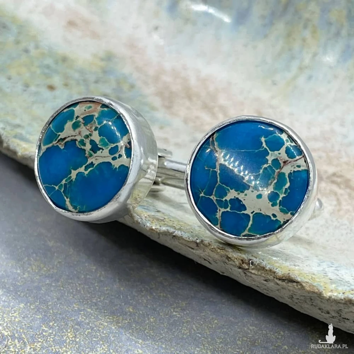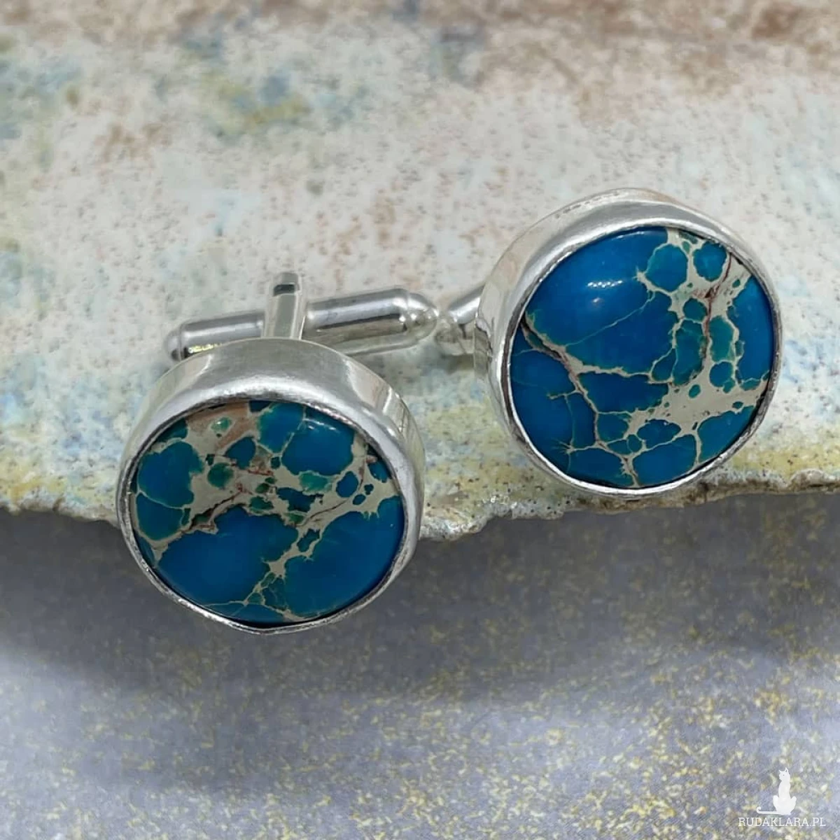 Okrągłe spinki do mankietów wykonane zostały ze srebra próby 925 i malowniczych jaspisów cesarskich. Oryginalne wybarwienie kamieni przywodzi na myśl wzburzoną morską toń. Srebro w procesie tworzenia było polerowane dla wydobycia z niego wyjątkowego blasku. Spinki będą stylowym uzupełnieniem męskiego stroju wieczorowego lub trafionym prezentem dla przyszłego pana młodego.