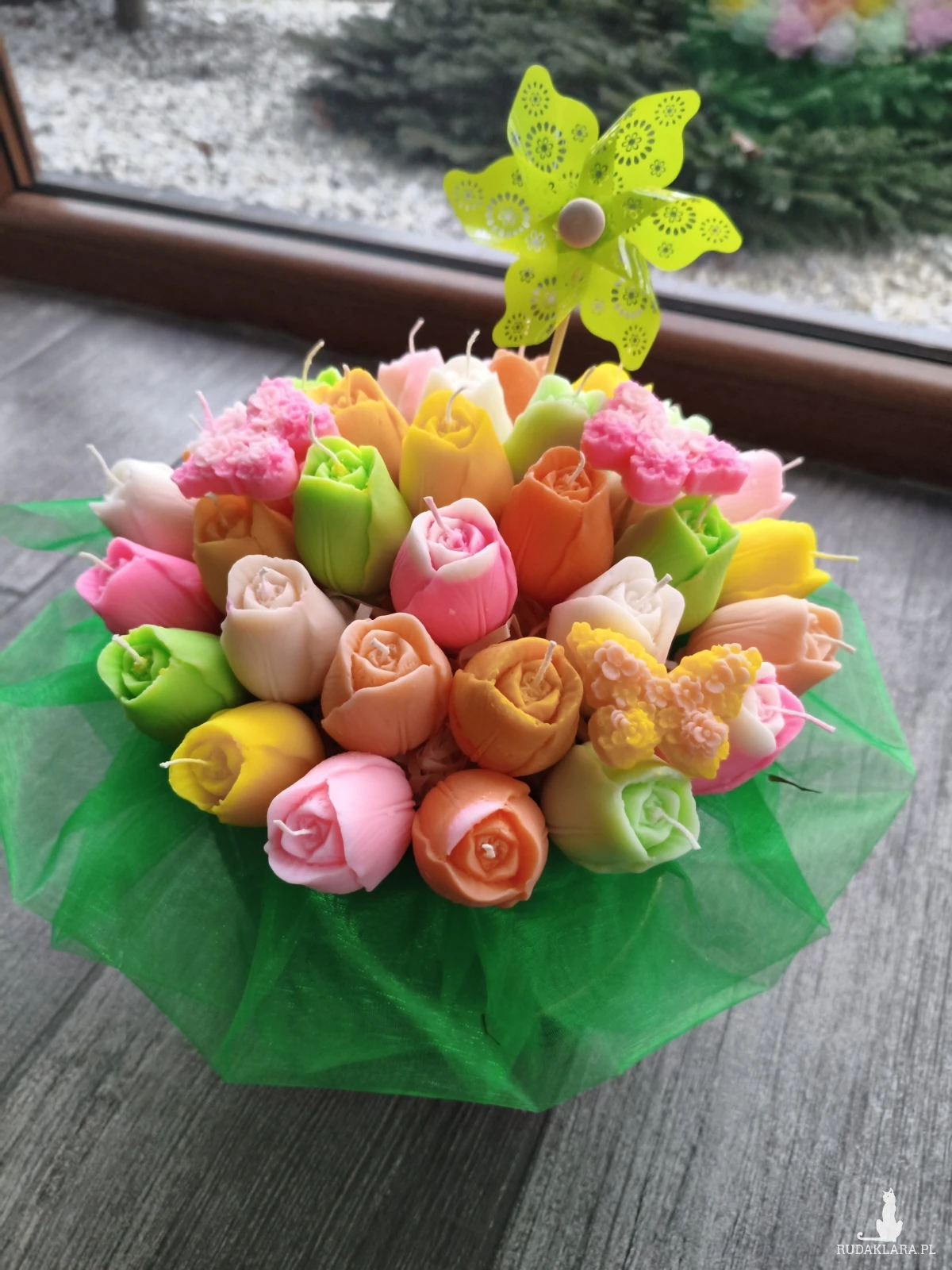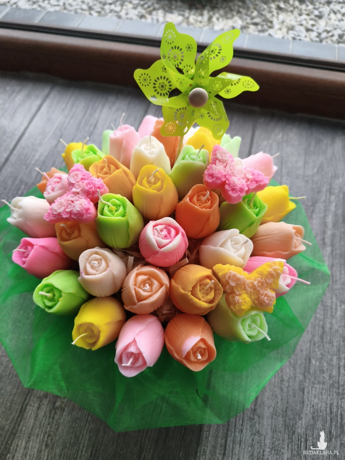 Flower box zawiera główki kwiatów które po wyciągnięciu z bukietu można zapalić. Flower box wysyłam zapakowany w celofan, wstążkę i bukiecik ze suszu oraz instrukcją palenia świec - gotowy do wręczenia jako prezent.