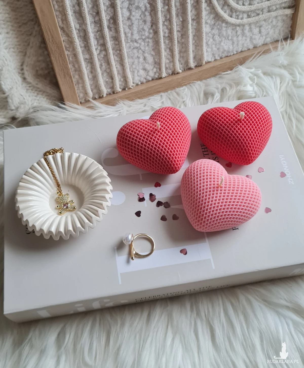 Zestwa świec sojowych 100 % handmade w kształcie serduszek w kolorze czerwonym i różowym. Tworzy przytulną atmosferę i stanowi świetny pomysł na oryginalny prezent na zbliżające się walentynki lub dzień kobiet.