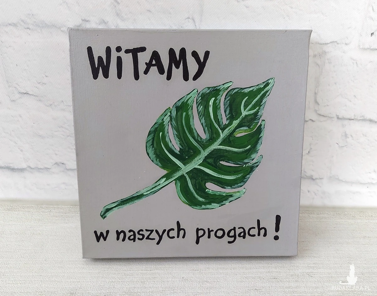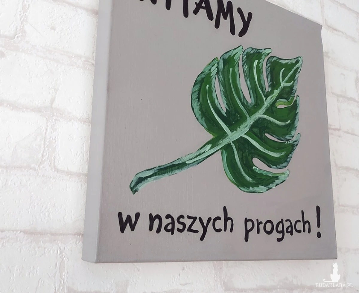 Liść monstery to piękny zielony akcent, który wzbogacony napisem mile powita gości.