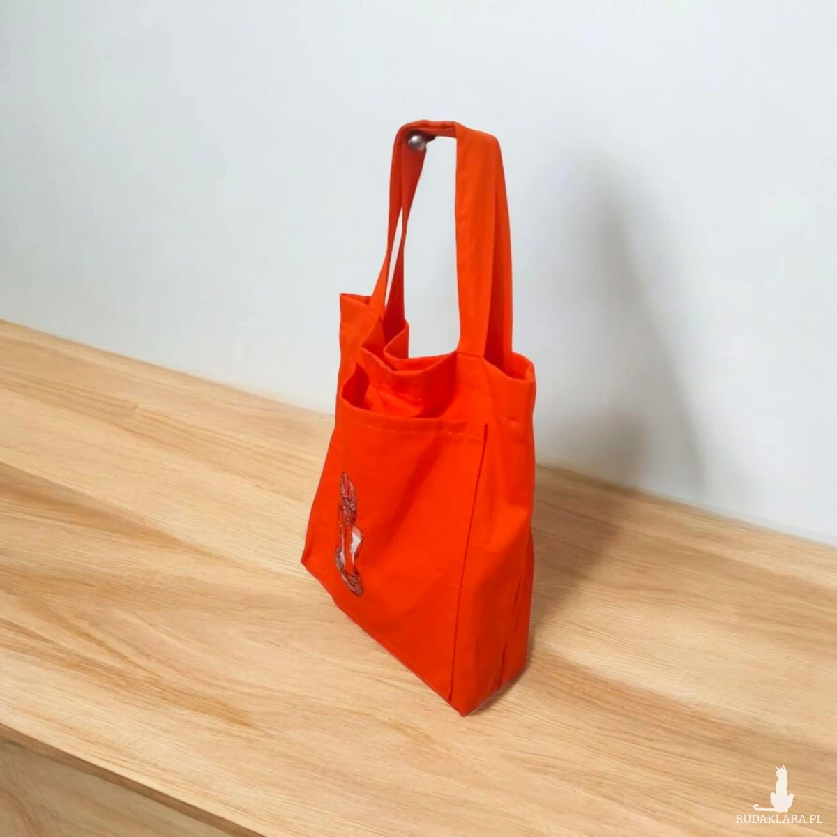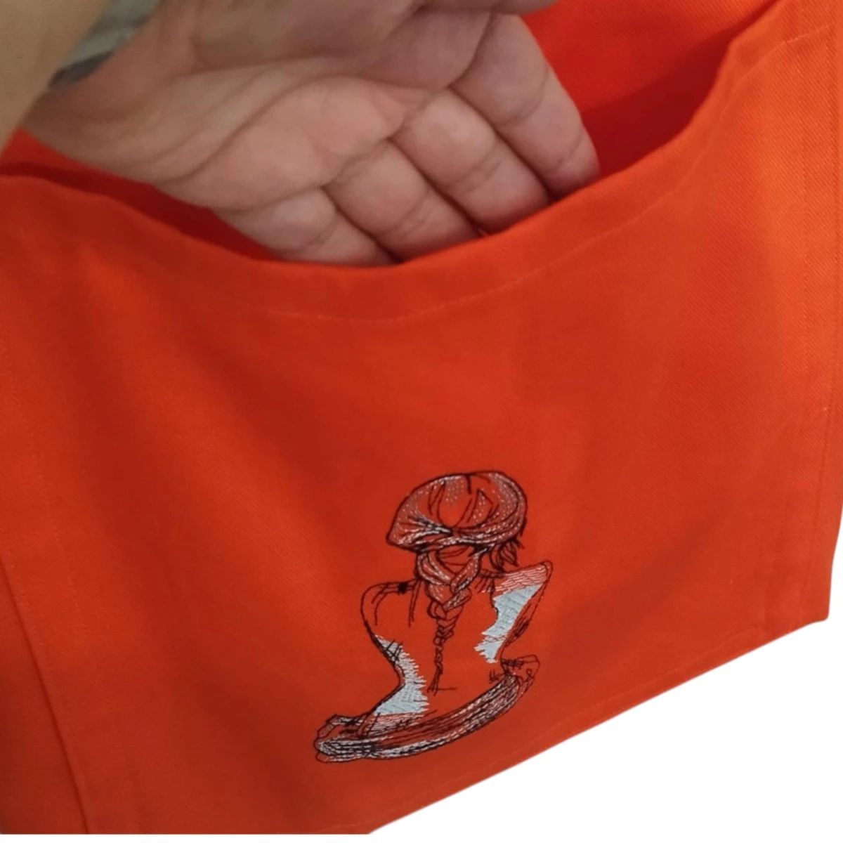 Przód torby z dużą kieszenią ozdobioną haftem.  Dno torby  poszerzone - tak aby mogła pomieścić wszystkie niezbędne drobiazgi i przydasie.
