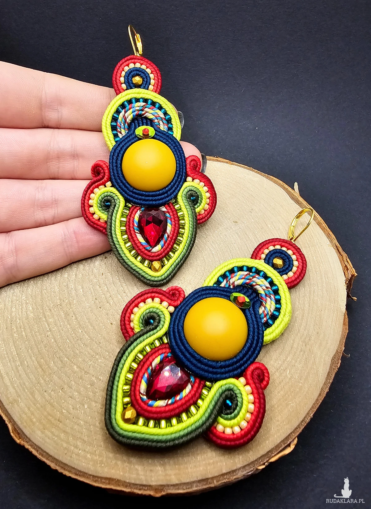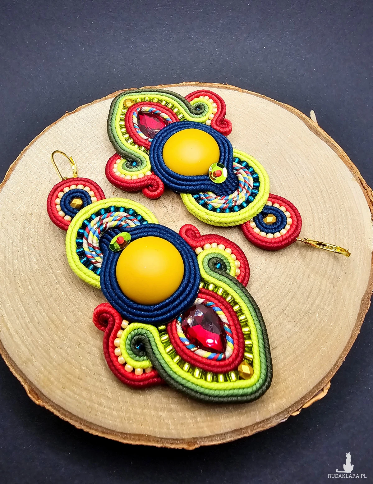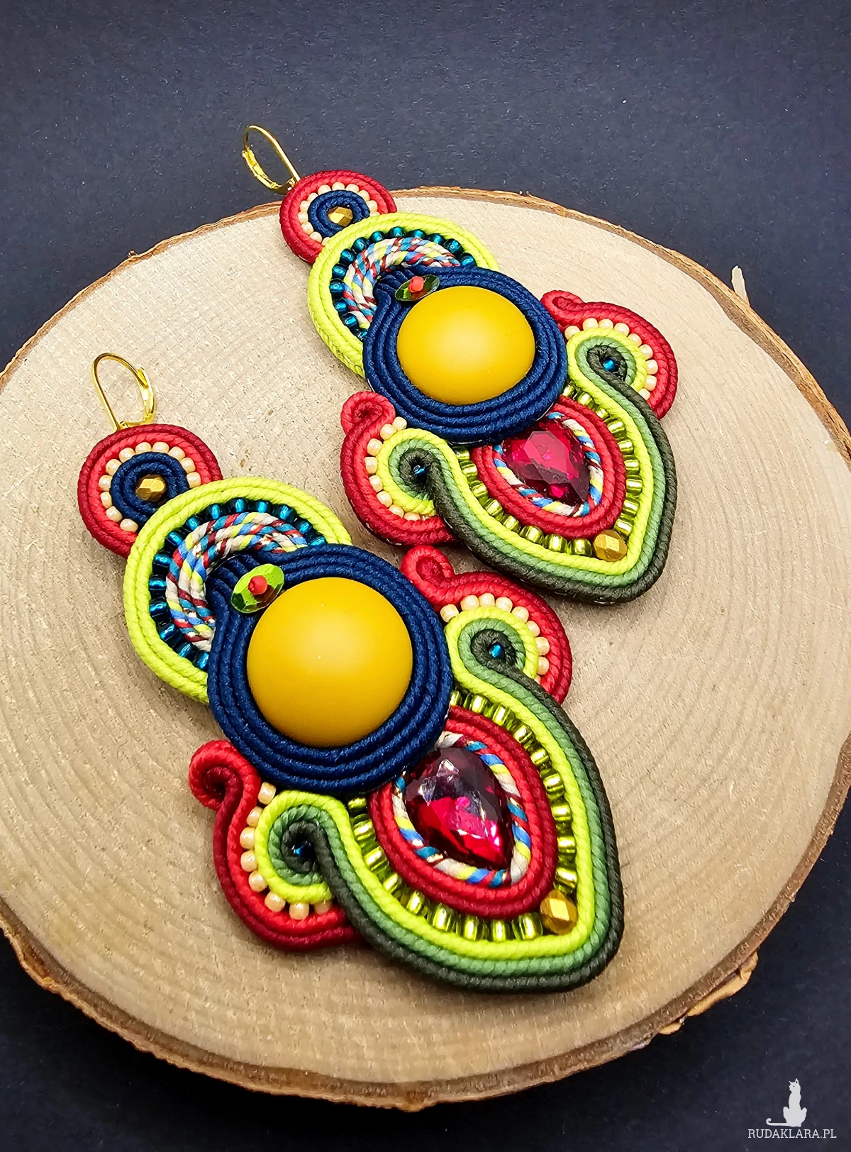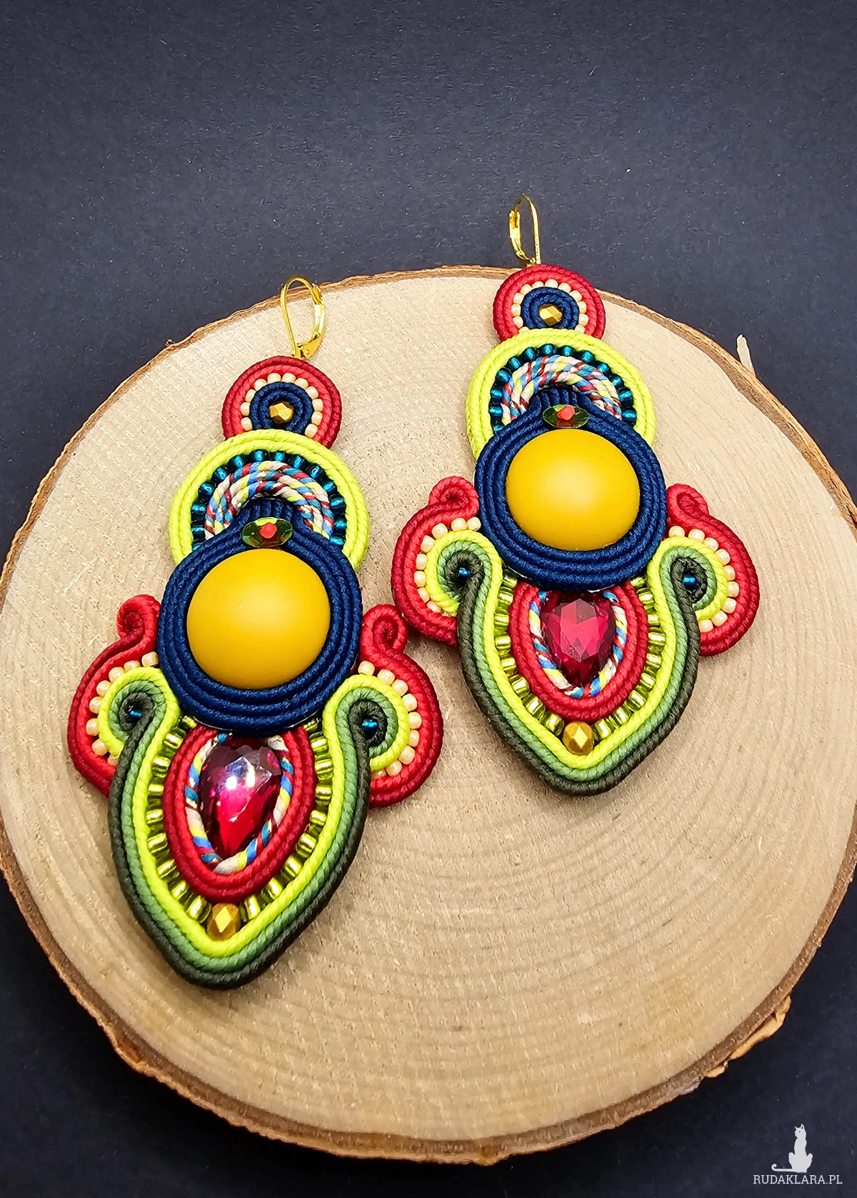 Matowe akrylowe kaboszony w kolorze miodowym otoczone polskimi sznurkami sutasz, szklanymi czeskimi i japońskimi koralikami o rożnych kształtach i wielkościach oraz niewielkimi fasetowanymi kryształkami. Kolory w kolczykach: miodowy, ciemny morski, czerwony, odcienie koloru zielonego, bordowy. Kolczyki zawieszone na biglach angielskich w kolorze złotym.
