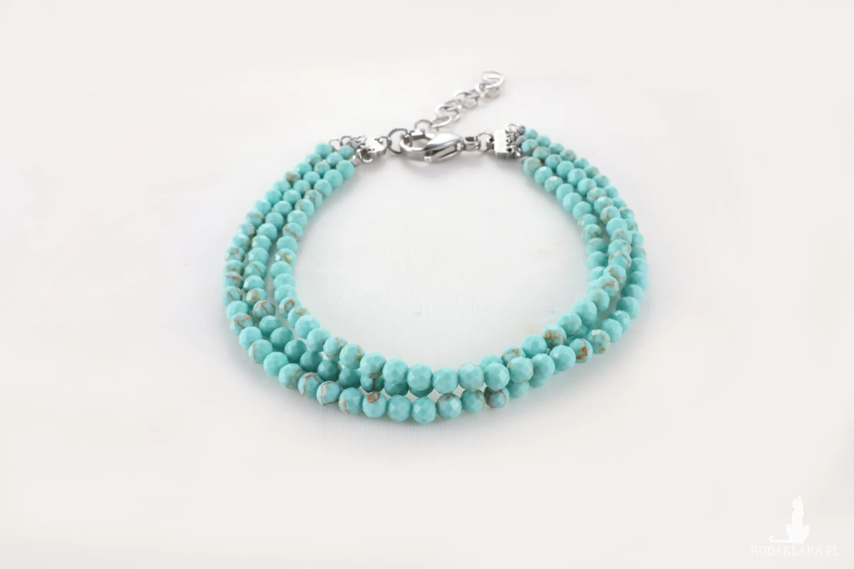 Bransoletka wykonana z trzech sznurów niebieskiego, fasetowanego magnezytu, który symbolizuje: harmonię, równowagę i spokój. Pomaga również redukować stres, napięcie i lęk. Jest kamieniem wspierającym rozwój duchowy i medytację, ponieważ sprzyja jasności umysłu, kreatywności i głębszemu zrozumieniu siebie. Wpływa również na poczucie bezpieczeństwa, wzmacnia intuicję i pomaga przezwyciężyć negatywne emocje. Doskonała na piękny prezent dla bliskiej osoby.