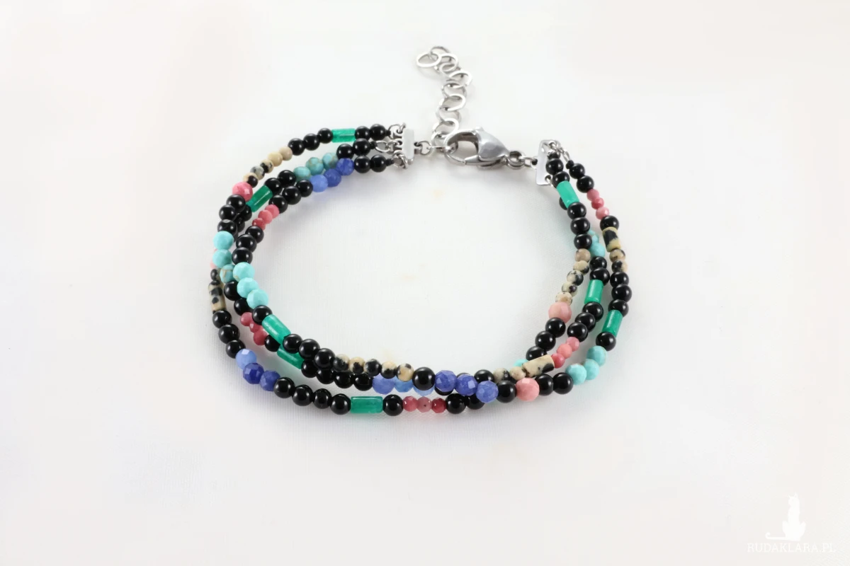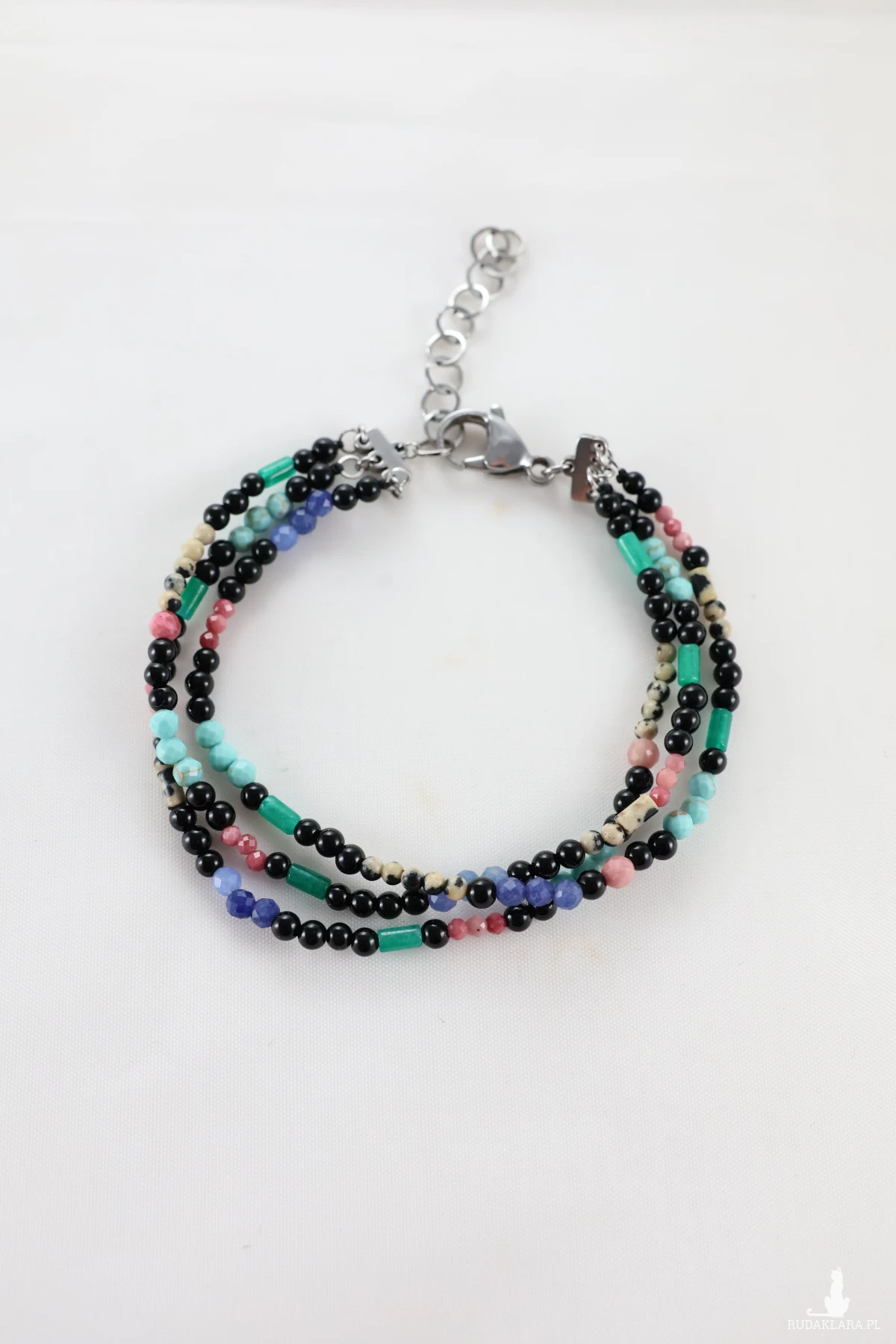 Bransoletka wykonana z trzech sznurów wielobarwnych i różnorodnych kamieni, które harmonijnie komponują się i przyciągają spojrzenia. Ta biżuteria to idealny wybór dla osób, które cenią indywidualizm i chcą nosić przy sobie pełne spektrum pozytywnych wibracji. Radość i energia. Bransoletka to prawdziwa paleta barw, skomponowana z drobnych, fasetowanych i gładkich koralików o różnych kształtach. Wśród kamieni znajdziesz m.in.: różowy rodonit, który symbolizuje miłość, równowagę i łagodność; magnezyt oznacza harmonię, równowagę i spokój; czarny onyks- siłę, stabilność, ochronę i wewnętrzną harmonię; akwamaryn- spokój, odwagę i jasność umysłu. Zielone koraliki: Symbolizują wzrost, odnowę i szczęście, a plamiste jaspisy wprowadzają stabilizację.