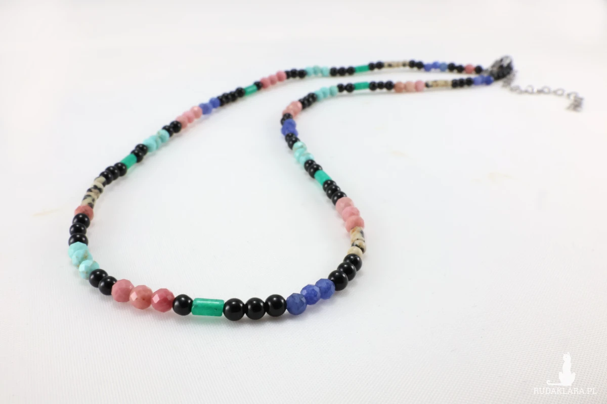 Unikatowy naszyjnik stworzony z mozaiki naturalnych kamieni szlachetnych. Ta biżuteria to idealny wybór dla osób, które cenią indywidualizm i chcą nosić przy sobie pełne spektrum pozytywnych wibracji. Radość i energia. Ten naszyjnik to prawdziwa paleta barw, skomponowana z drobnych, fasetowanych i gładkich koralików o różnych kształtach. Wśród kamieni znajdziesz m.in.: różowy rodonit, który symbolizuje miłość, równowagę i łagodność; magnezyt oznacza harmonię, równowagę i spokój; czarny onyks- siłę, stabilność, ochronę i wewnętrzną harmonię; akwamaryn- spokój, odwagę i jasność umysłu. Zielone koraliki: Symbolizują wzrost, odnowę i szczęście, a plamiste jaspisy wprowadzają stabilizację.