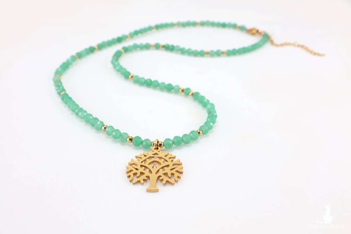 Odkryj harmonię natury i elegancji z tym wyjątkowym naszyjnikiem, który łączy w sobie głębokie znaczenie z subtelnym blaskiem. Naturalny, fasetowany Awenturyn w kolorze zieleni, znany jako kamień szczęścia, spokoju i dobrobytu. Stylowe, ażurowe Drzewo Życia - symbol siły, wzrostu, rodziny i połączenia ze światem. Wykonane ze stali chirurgicznej (nierdzewnej) w kolorze złotym, co zapewnia trwałość i hipoalergiczność. Drobne, złote koraliki ze stali chirurgicznej dodają blasku i rozdzielają zielone kamienie, tworząc elegancki rytm. Idealny dodatek do stylizacji casualowych i boho, ale też jako dyskretny, kolorowy akcent do bardziej formalnego ubioru.