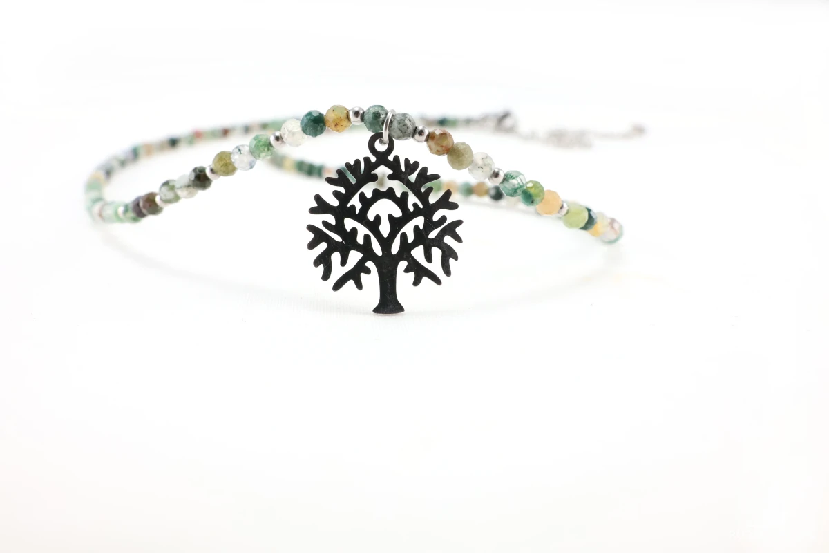 Szukasz biżuterii, która łączy piękno natury z głęboką symboliką? Oto idealny naszyjnik dla Ciebie! Drobne, fasetowane koraliki to naturalny Agat indyjski – każdy kamień jest unikatowy i wygląda jak mała, leśna mikrokraina w odcieniach zieleni, bieli i brązu. Agat indyjski jest kamieniem spokoju, odnowy i uzdrawiania. Jego energia wspiera równowagę i pomaga połączyć się z naturą. Wisiorek Drzewo Życia ze stali chirurgicznej symbolizuje siłę, wzrost, rodzinę i nieustanne odradzanie się. Jego srebrny kolor idealnie pasuje do naturalnych barw kamieni.
