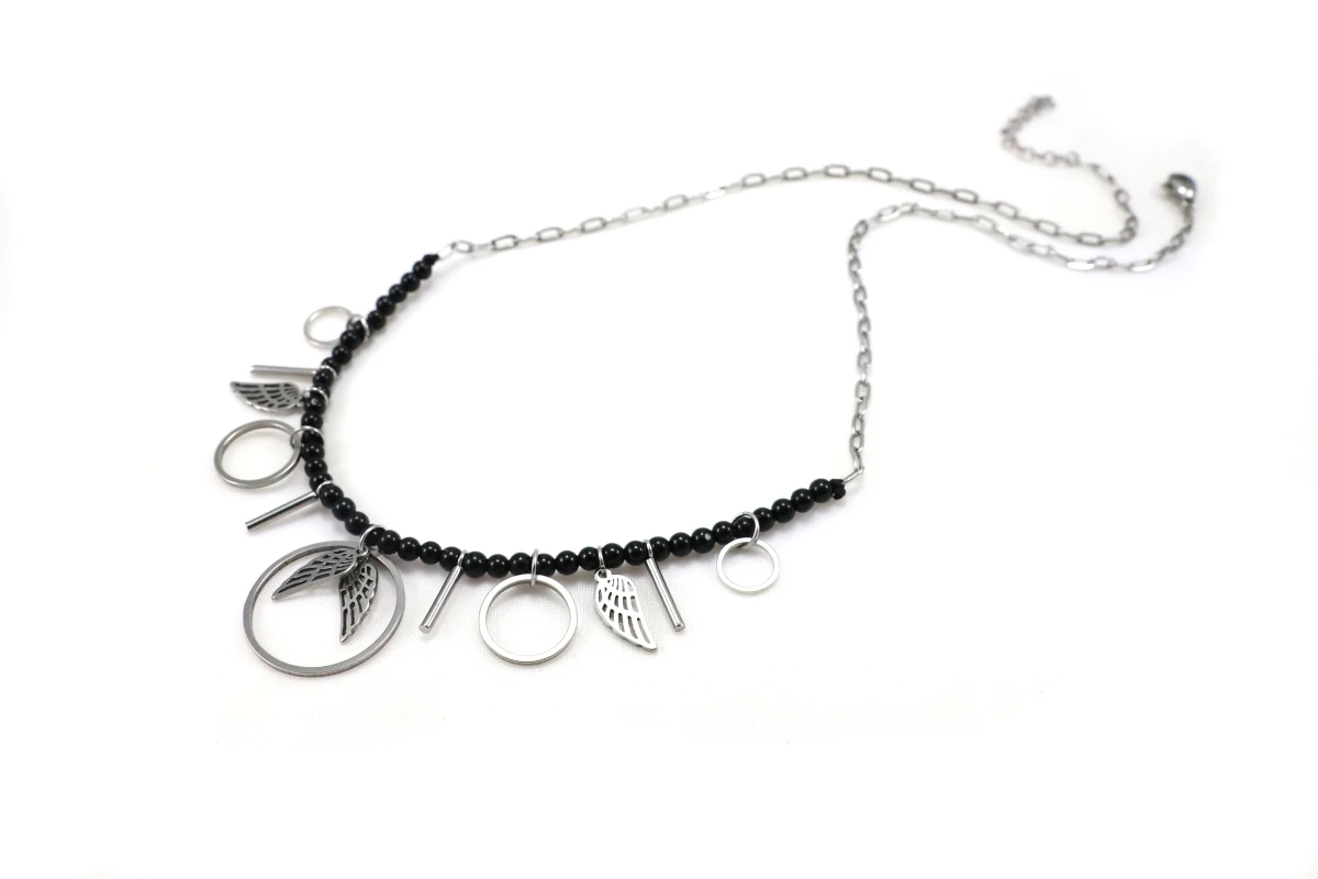Wyrazisty naszyjnik ze skrzydłami i onyksem. Efektownie łączy ze sobą głęboką czerń onyksu z subtelnymi, metalowymi zawieszkami. Kamienie onyksu słyną ze swoich właściwości dodających pewności siebie, siły i ochrony przed negatywną energią. Zawieszki w kształcie skrzydeł stanowią uniwersalny symbol wolności, lekkości i duchowej ochrony.