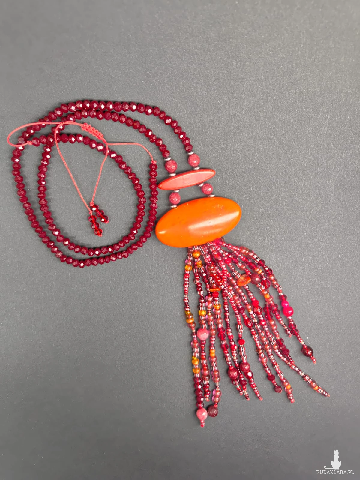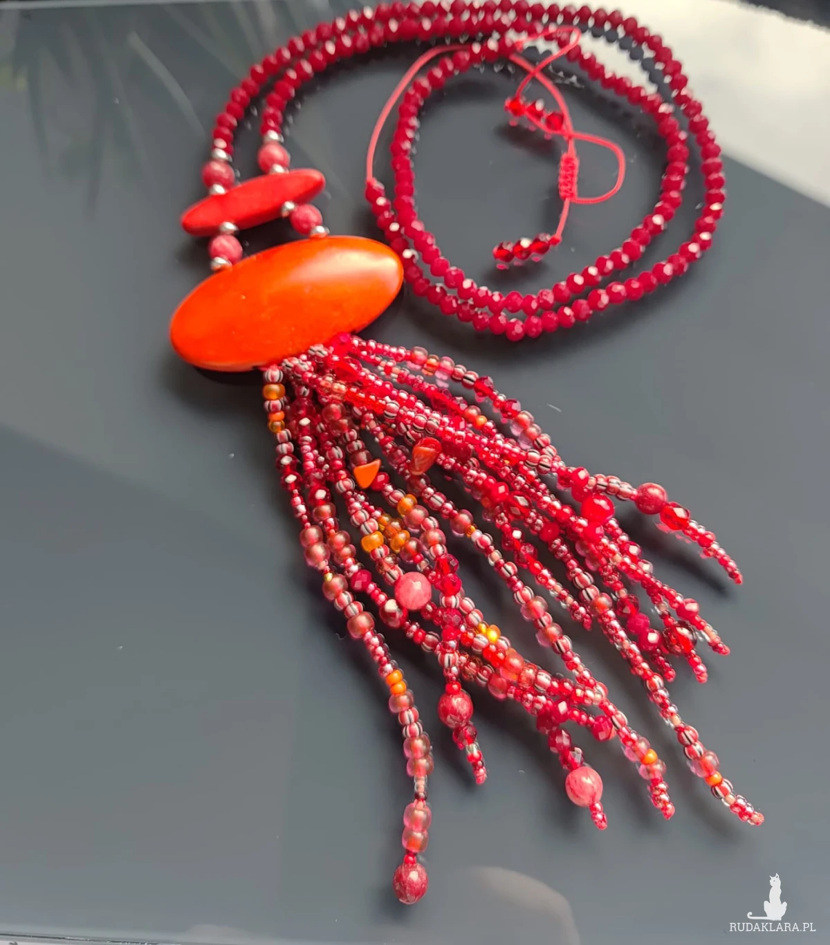 Naszyjnik Długi Sznur Czerwonych Korali Z Frędzlami
