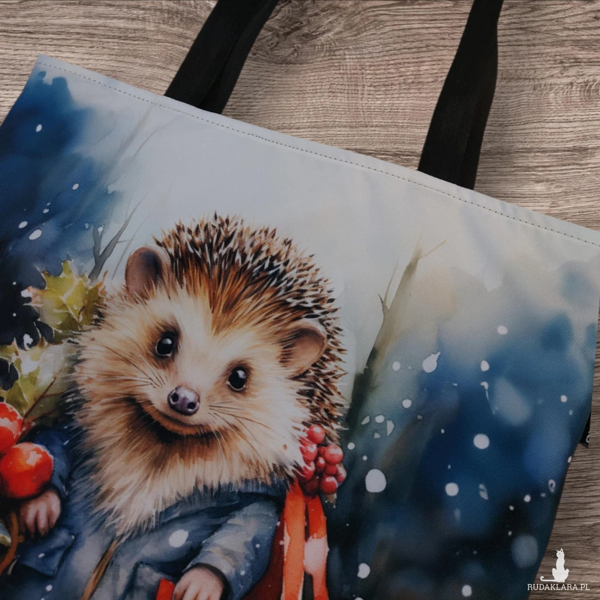 Na przodzie torby znajduje się panel wodoodporny z jeżem. Tył torby to czarna, pikowana tkanina wodoodporna. Rączki posiada z czarnej taśmy nośnej do noszenia na ramieniu.
