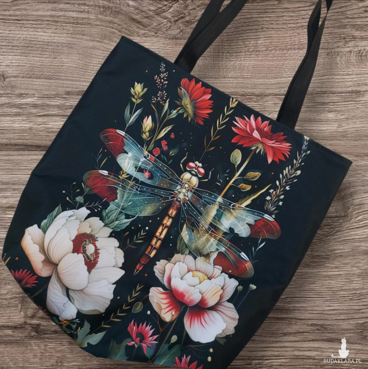 Na przodzie torby znajduje się panel wodoodporny z ważką. Tył torby to czarna, pikowana tkanina wodoodporna. Rączki posiada z czarnej taśmy nośnej do noszenia na ramieniu.