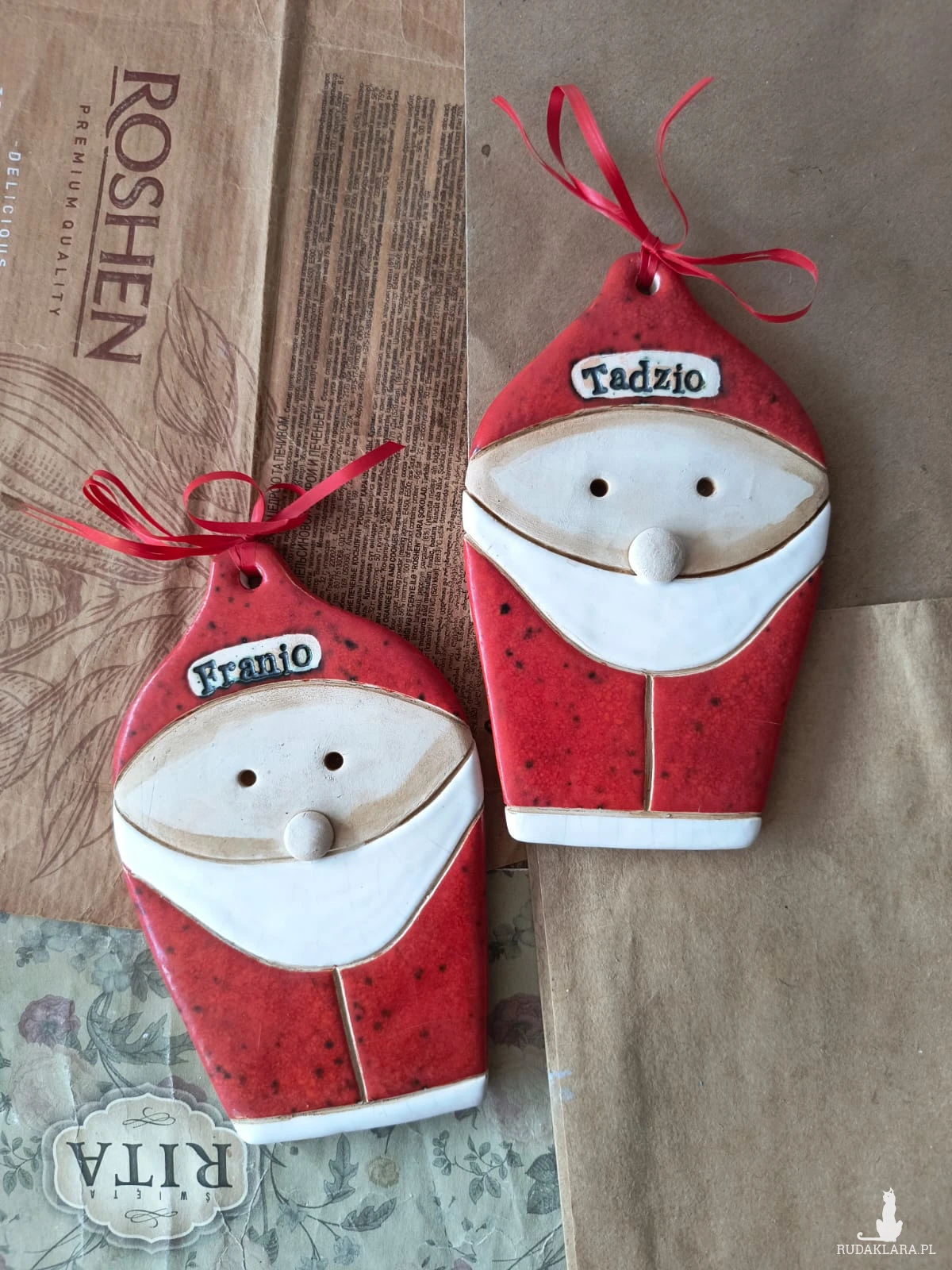 Zawieszki Mikołaja wykonane z gliny szamotowej, wypalone na biskwit, a następnie szkliwiona w temp. 1260 st., przeznaczone do powieszenia. Wysokość około 12 cm. W wiadomości dla artysty proszę wpisać imiona. Idealne do ozdoby domu lub jako upominek. Serdecznie polecam.