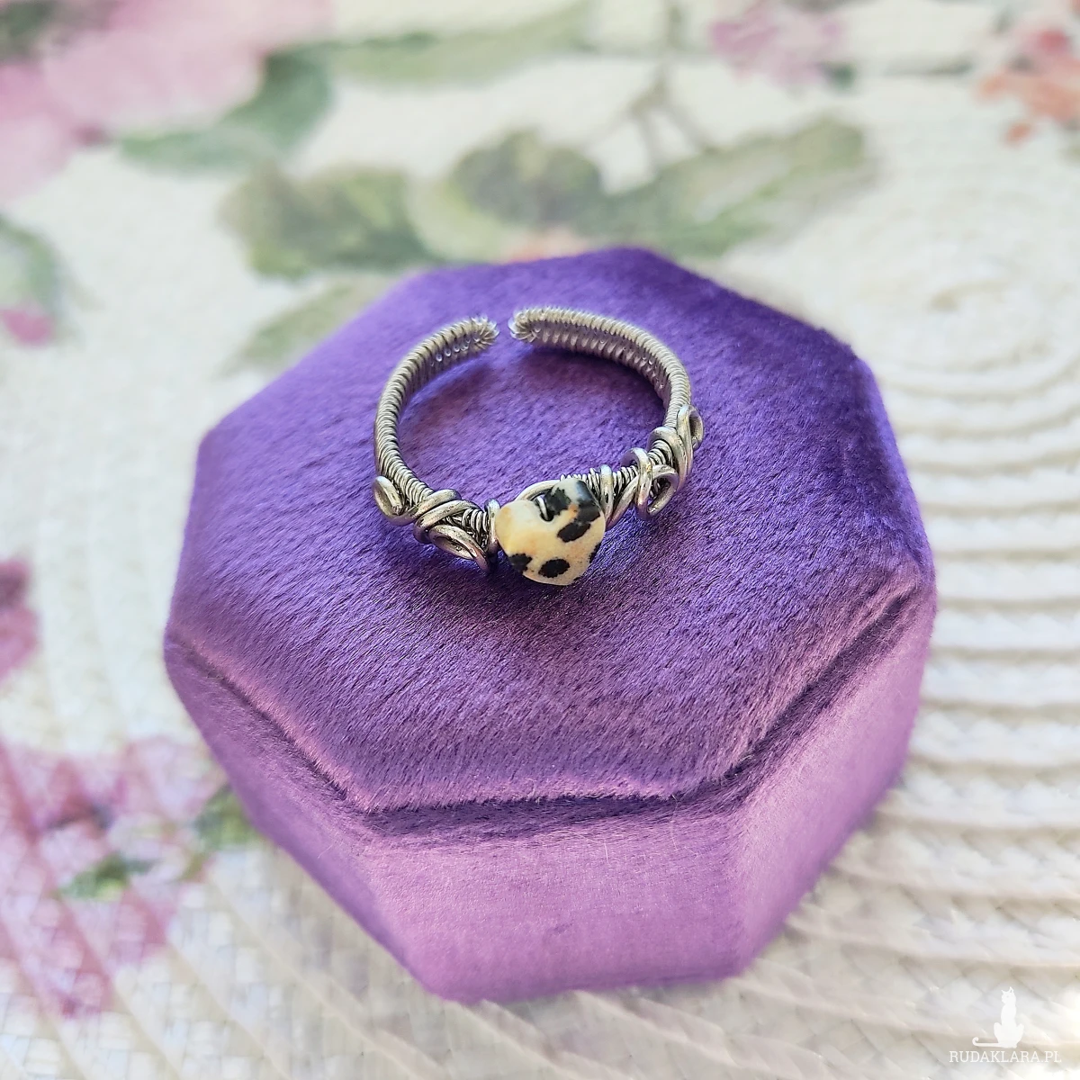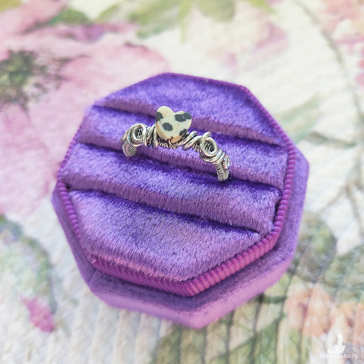 Pierścionek Jaspis Dalmatyński Serce ręcznie robiony. Wykonany techniką wire wrapping z drutów ze stali chirurgicznej.