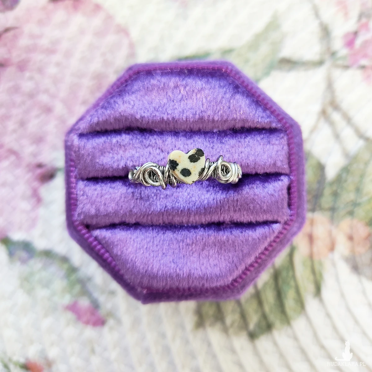 Pierścionek Jaspis Dalmatyński Serce zapakowany w ozdobne pudełko.