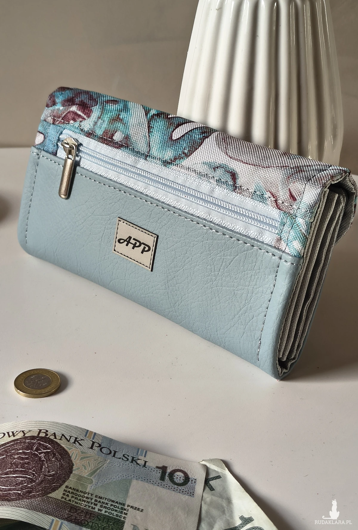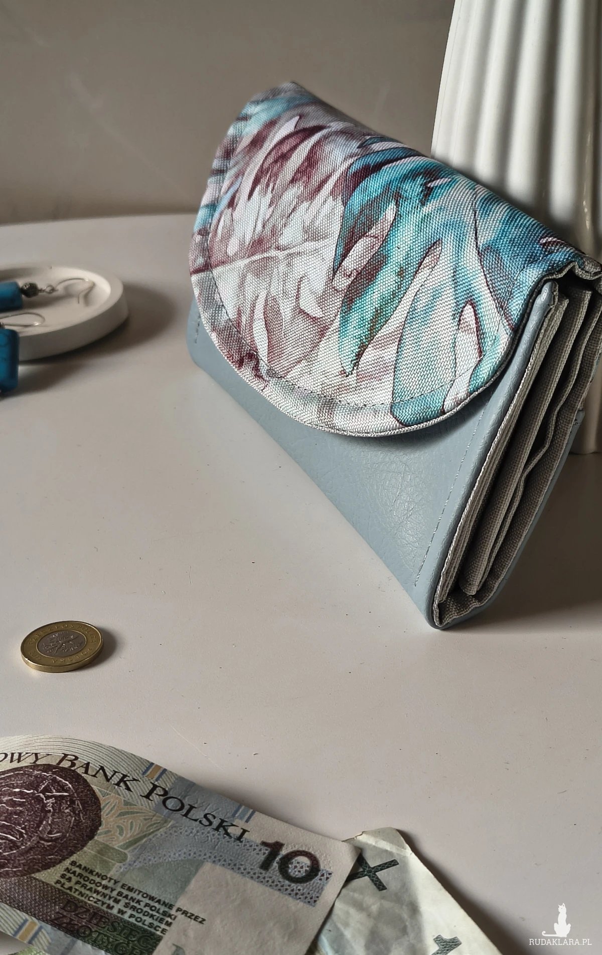 Przedstawiam duży portfel w kolorze brudnego błękitu, Wykonany z ekoskóry oraz materiału wodoodpornego w liście monstery..
