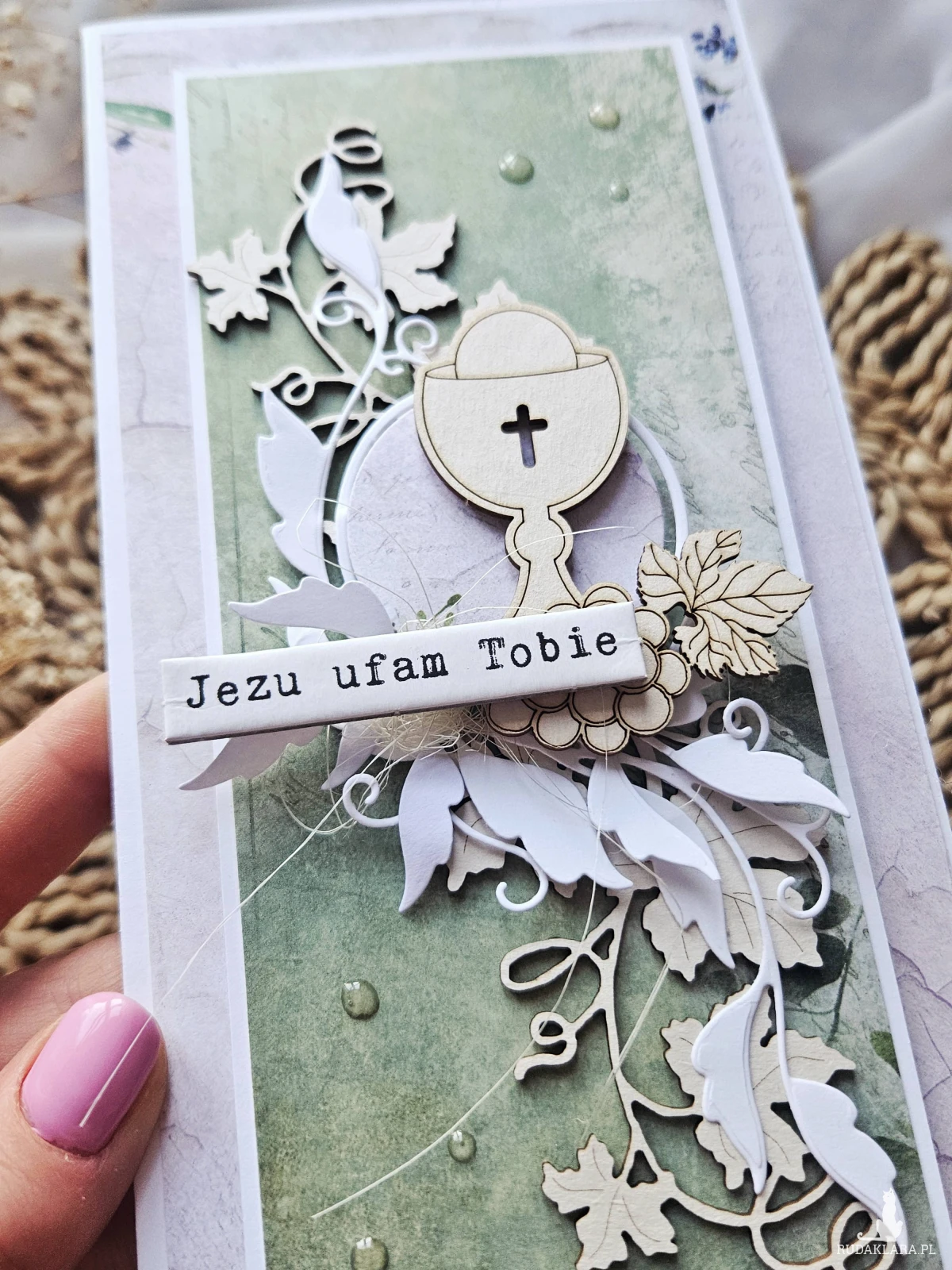 Kartka oklejona papierami z nadrukiem w kolorze zielonym i fioletowym. Na froncie kielich z hostią na drewienku oraz napis.