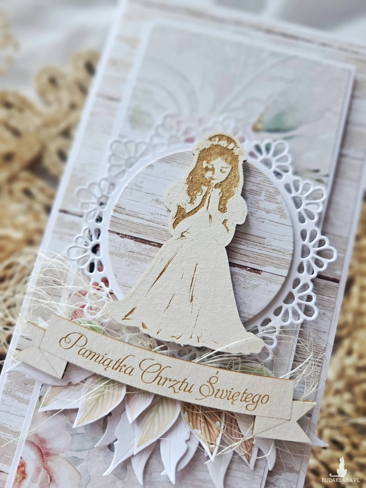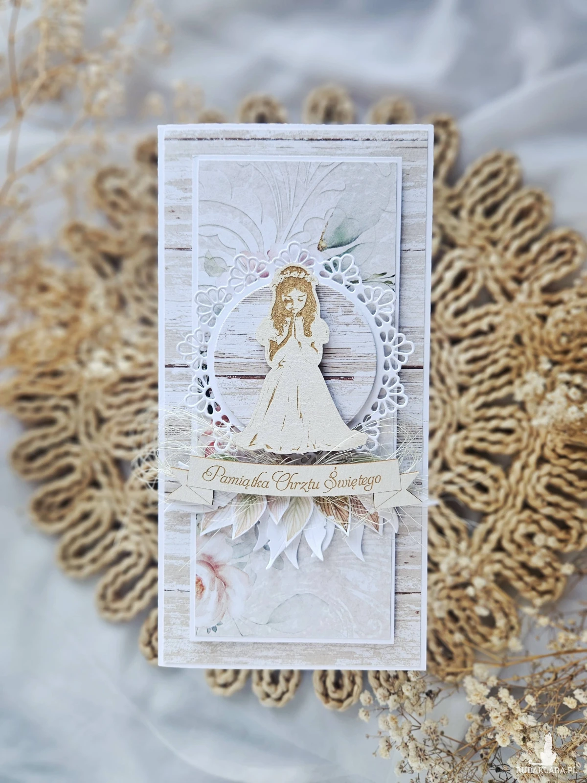 Kartka oklejona papierami z nadrukiem w kolorze beżpowym. Na froncie sylwetka dziwczynki na drewienku oraz napis. Jako dodatki elementy papierowe.