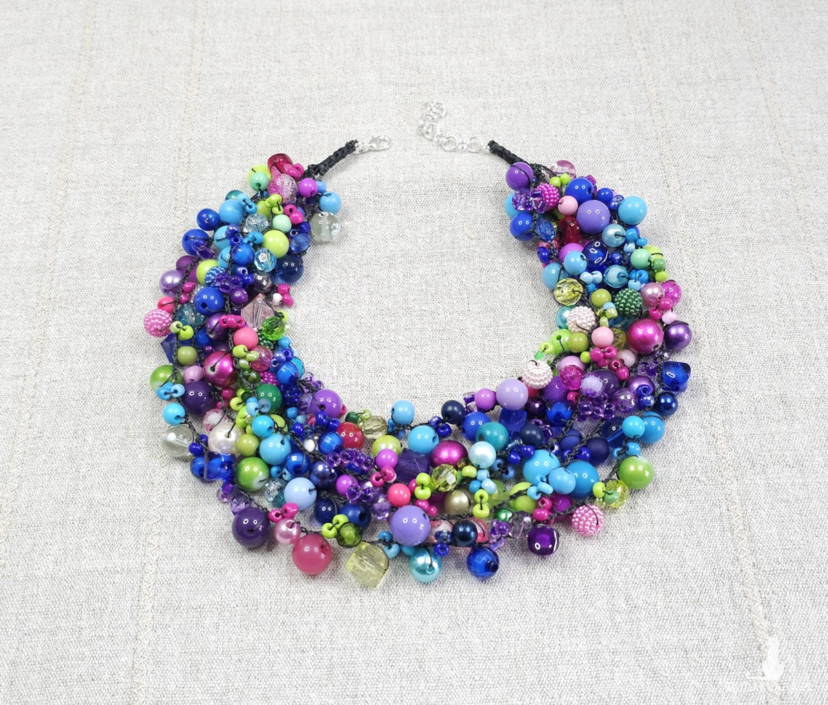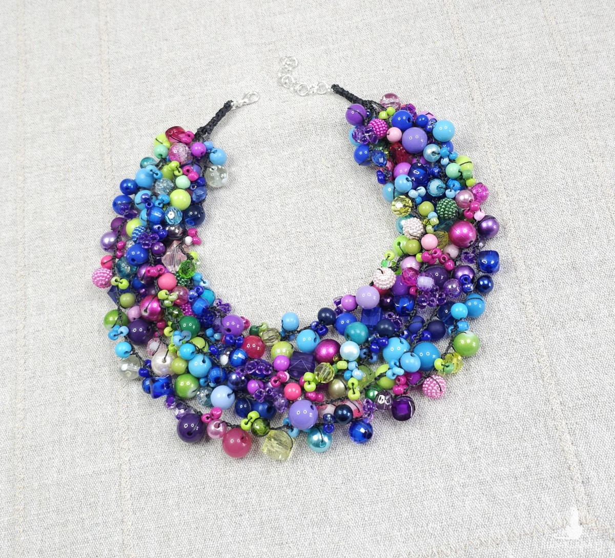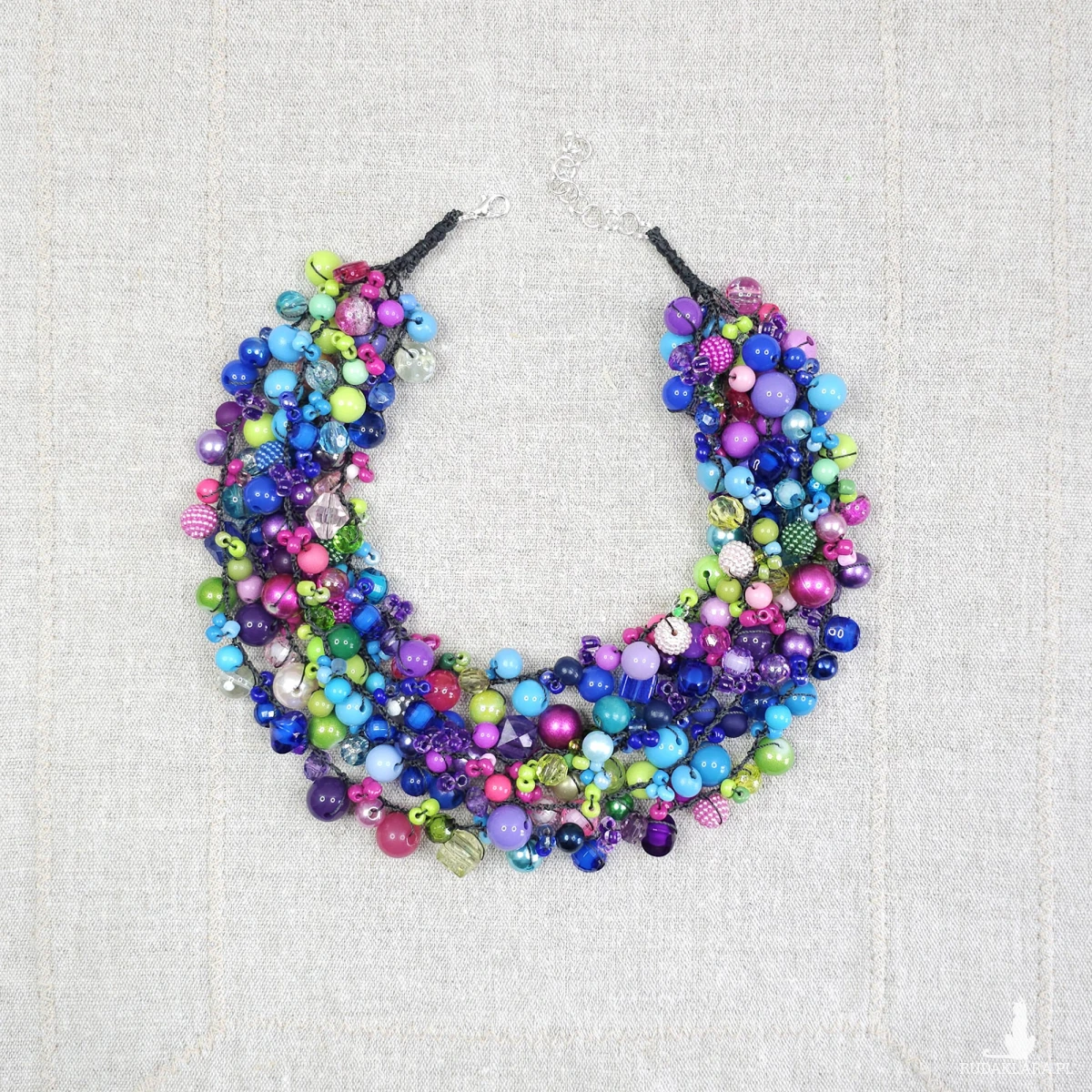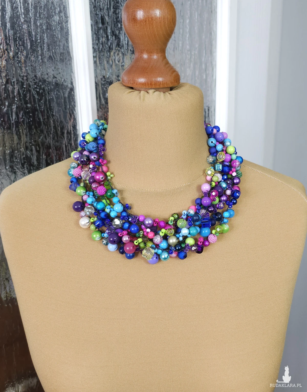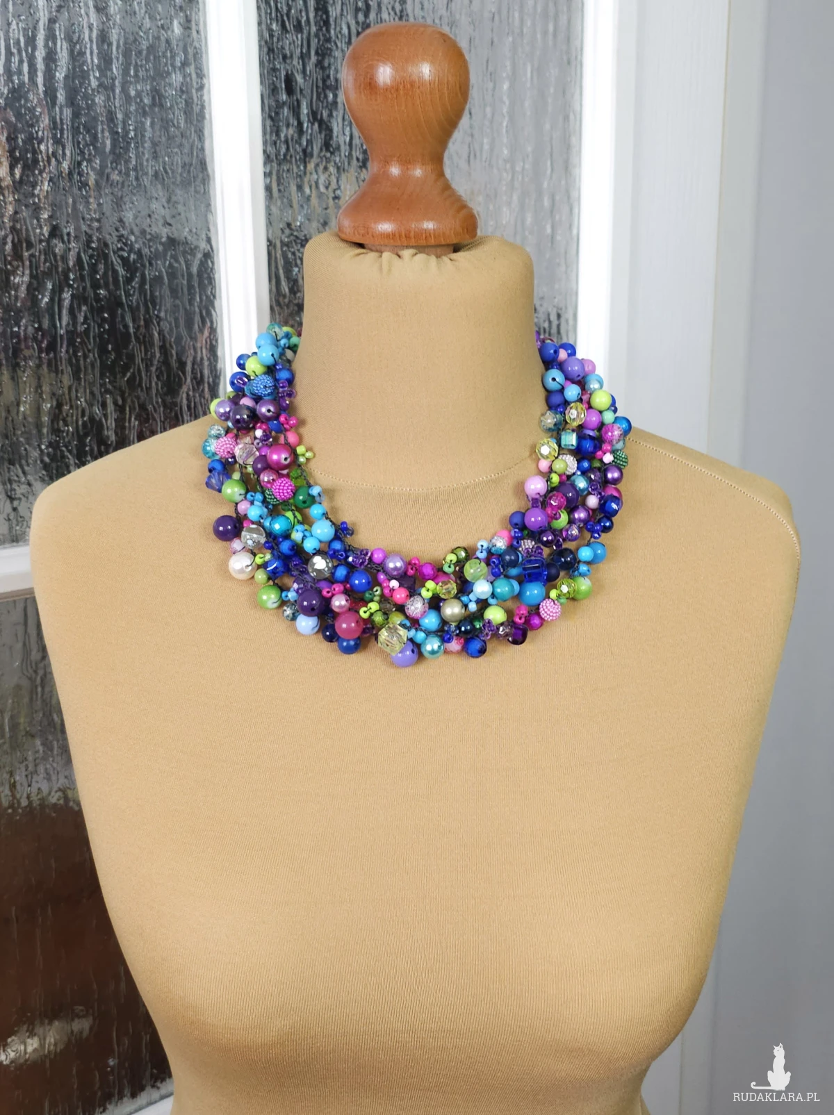 Ten ręcznie wykonany naszyjnik to harmonijne połączenie intensywnych barw i różnorodnych tekstur.