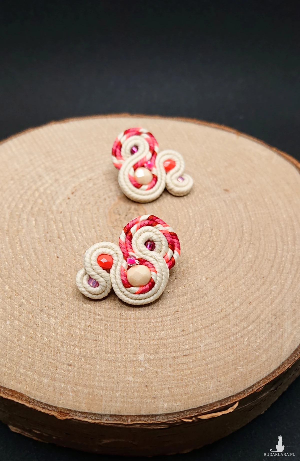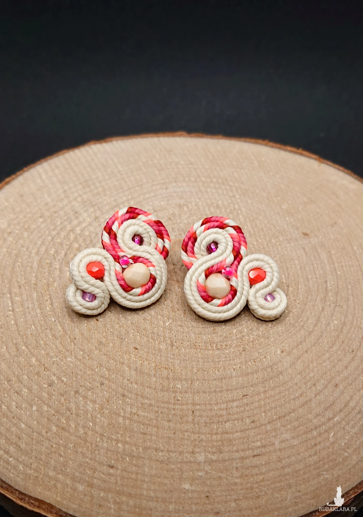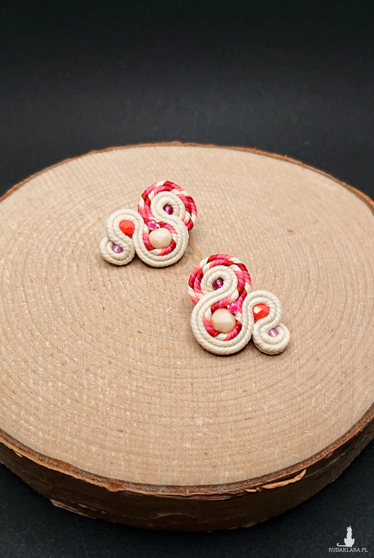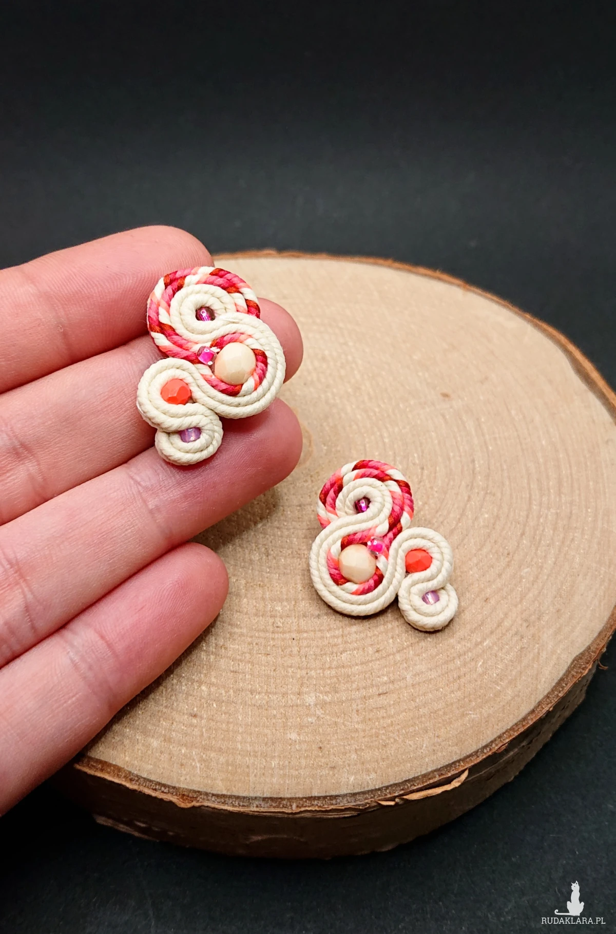Niewielkie kolczyki sutasz wykonane z szklanych koralików oraz polskich sznurków sutasz. Kolory w kolczykach: kremowy, różowy, neonowy różowy. Kolczyki zamocowane na sztyftach ze stali chirurgicznej.