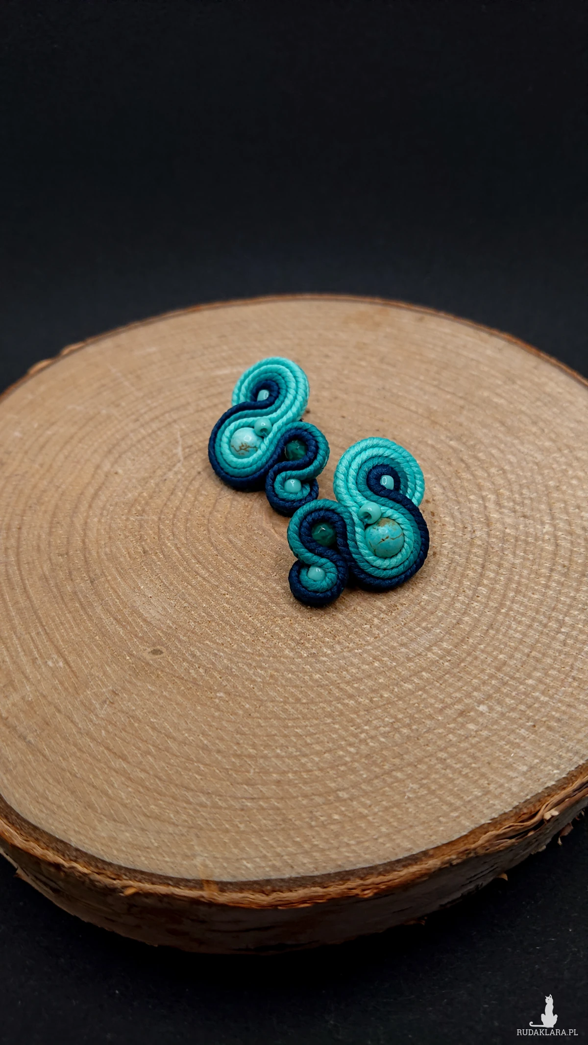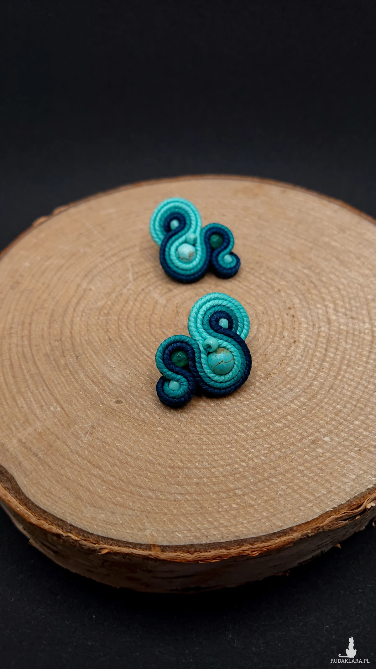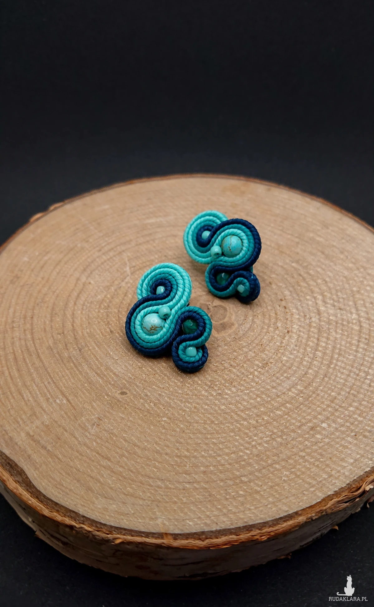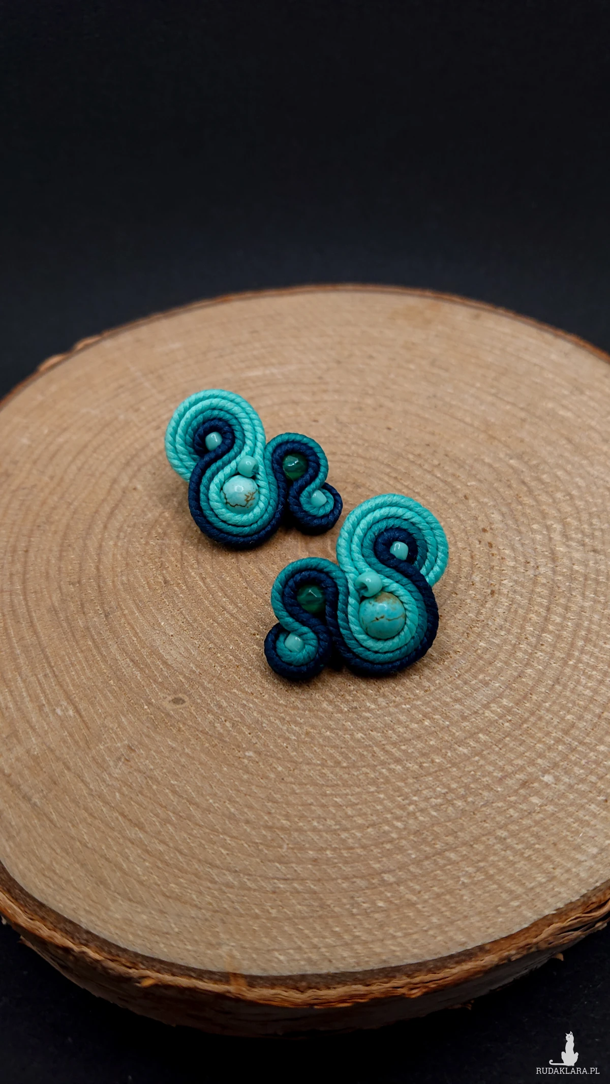 Niewielkie kolczyki sutasz wykonane z szklanych koralików oraz polskich sznurków sutasz. Kolory w kolczykach: turkusowy, morski. Kolczyki zamocowane na sztyftach ze stali chirurgicznej.