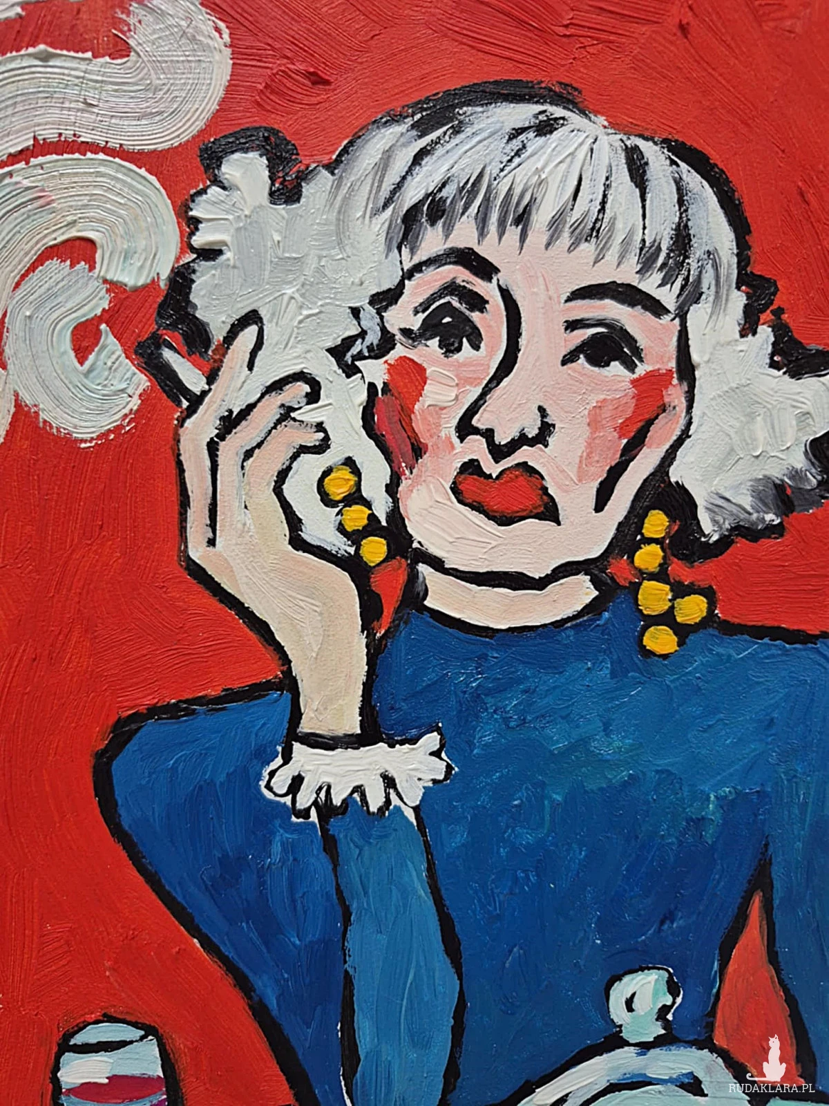 Na tle intensywnej, niemal krzyczącej czerwieni siedzi kobieta jak wycięta z własnych myśli. Ma twarz zbudowaną z grubych, zdecydowanych pociągnięć pędzla — trochę surową, trochę czułą. Jej spojrzenie nie szuka kontaktu z widzem jest gdzieś obok, może w przeszłości, może w planach na później. Białe włosy układają się jak chmury, a dym, który unosi się z papierosa, zdaje się być ich przedłużeniem — myślą, która nie chce zostać wypowiedziana.