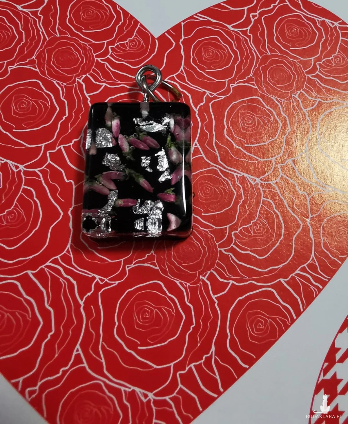 Naszyjnik z wrzosami i srebrnymi drobinkami. Łańcuszek gratis. Długość wisiorka 20 mm szerokość 15mm.