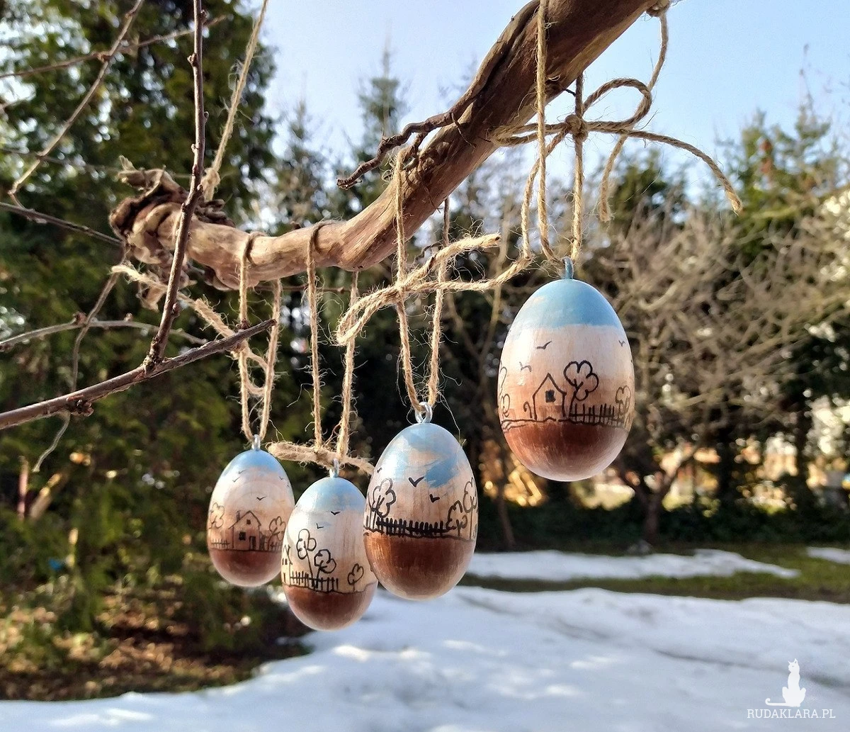 Malowane farbami akrylowymi, kontury wykonane pisakiem permamentnym. Całość zabezpieczona lakierem akrylowym - to jest nietoksyczny, bezzapachowy i matowy lakier. Jeśli jajka się zabrudzą, wystarczy je przetrzeć wilgotną ściereczką.