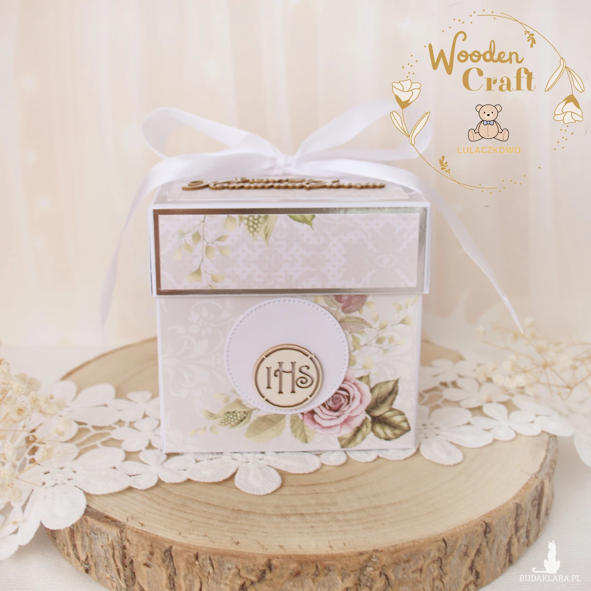 Wieczko boxa zdobi biała kokarda oraz tekturkowy napis "Pierwsza Komunia Święta" (do napisu mogę dodać również imię dziecka oraz datę uroczystości).