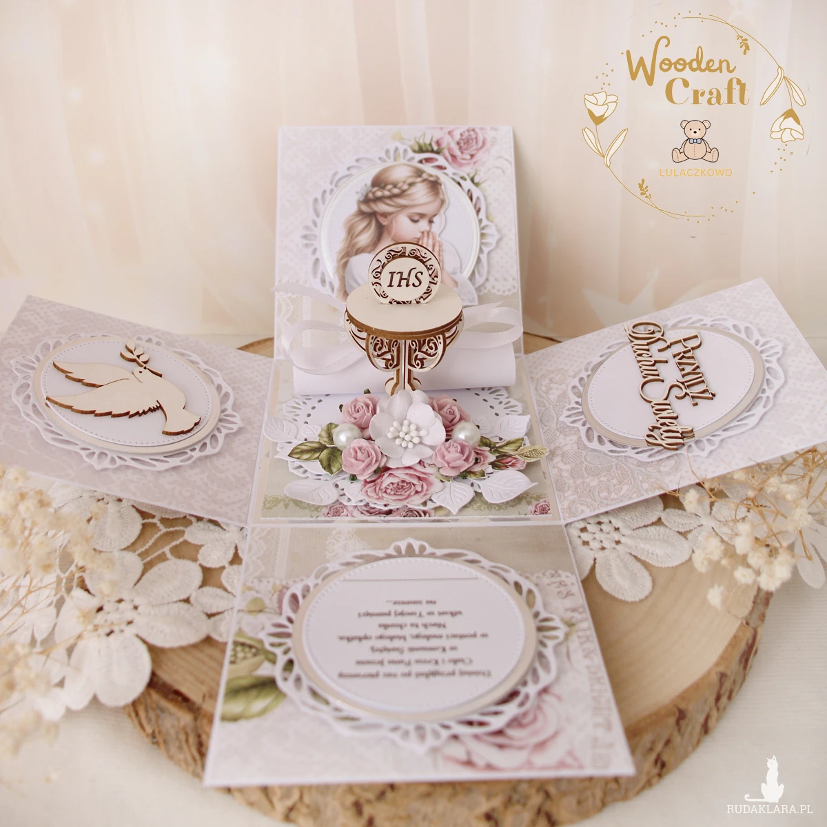 Wewnątrz boxa znalazła się, przepiękna tekturka 3D kielich z hostią świętą, otoczony kompozycją kwiatową. Na ściankach boxa umieszczona została grafika modlącej się dziewczynki komunijnej, tekturka gołębicy oraz cytat "Przyjdź Duchu Święty", a także życzenia. Za tekturką 3D umieszczona została wstążeczka, którą można przewiązać zwinięte w rulonik banknoty.