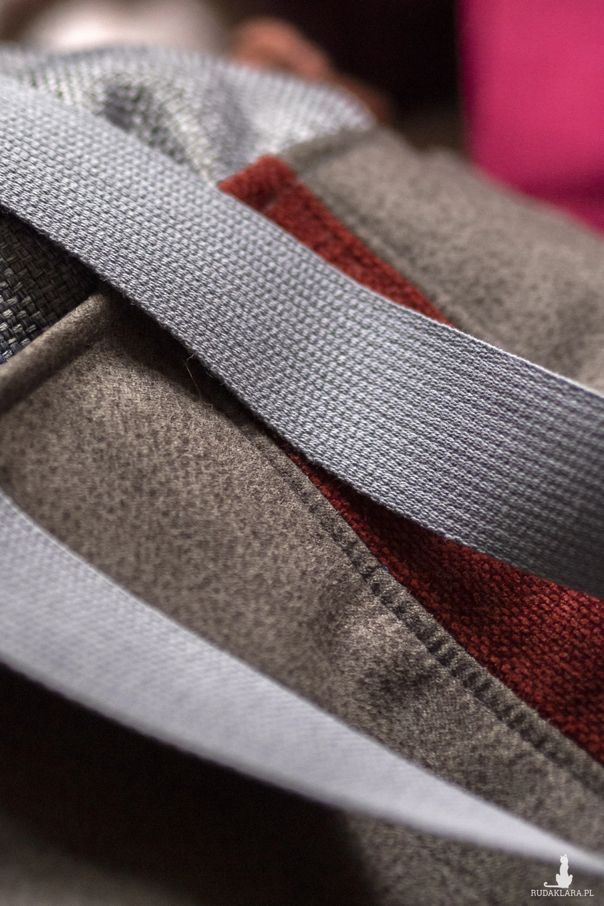 Workoplecak posiada regulowane, bawełniane paski grubości 3cm w kolorze szarym.