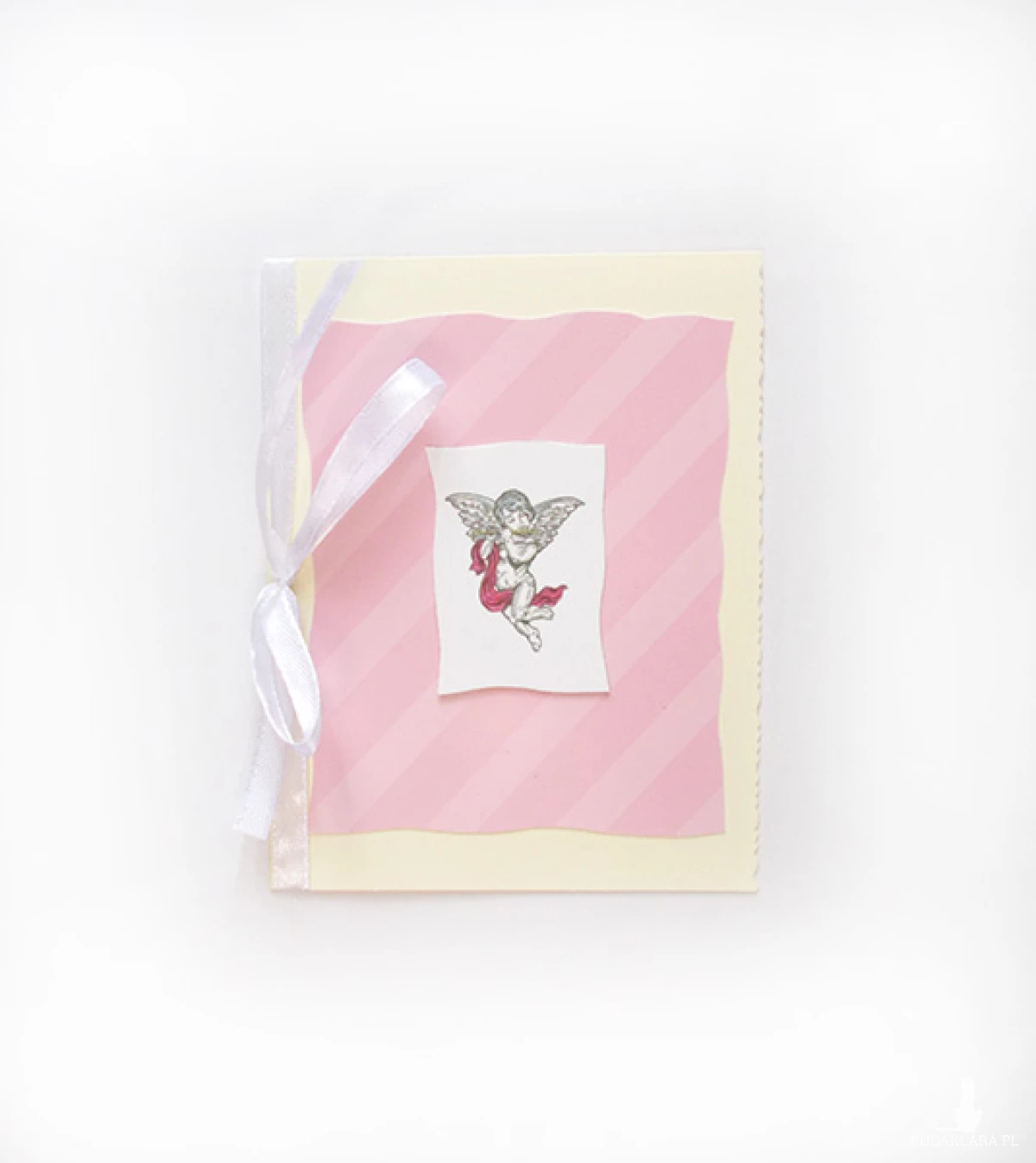 Pastelowa, otwierana kartka z małym aniołkiem, amorkiem. Karnet w stylu retro, vintage, ozdobiony białą wstążeczką., kremowy kartonik. Kartka jest bez życzeń. Dołączona biała koperta.