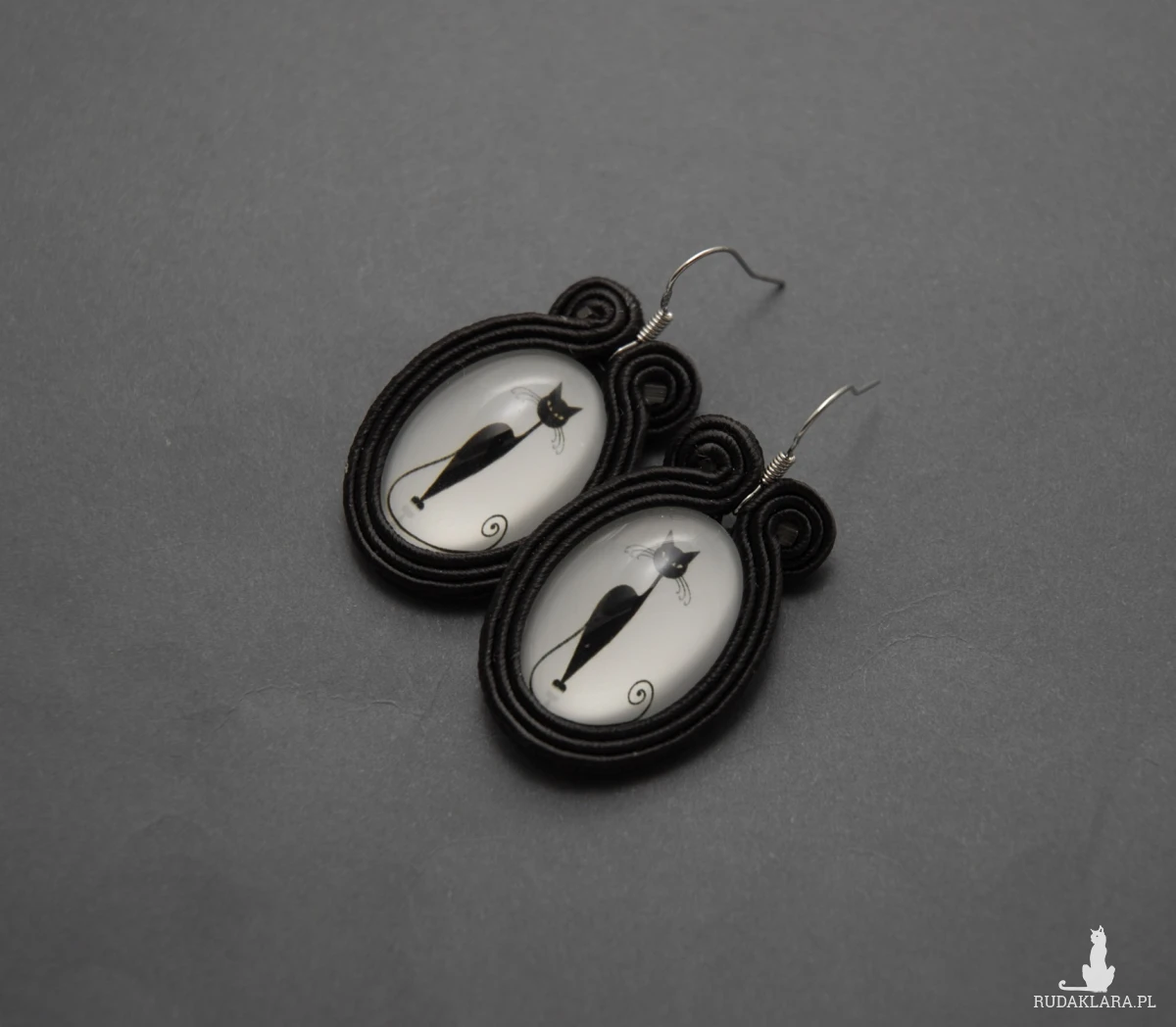 oferuję kolczyki zrobione techniką sutasz, ozdobione kaboszonami z wizerunkiem kota