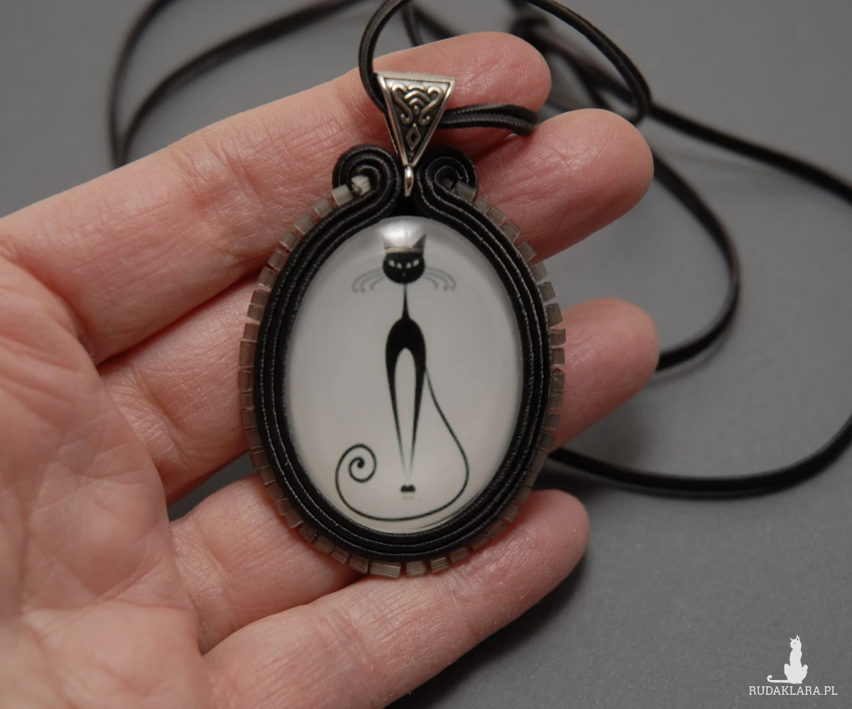 oferuję wisiorek zrobiony techniką sutasz, ozdobiony kaboszonem z kotem i koralikami