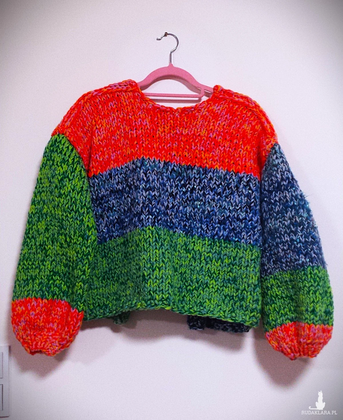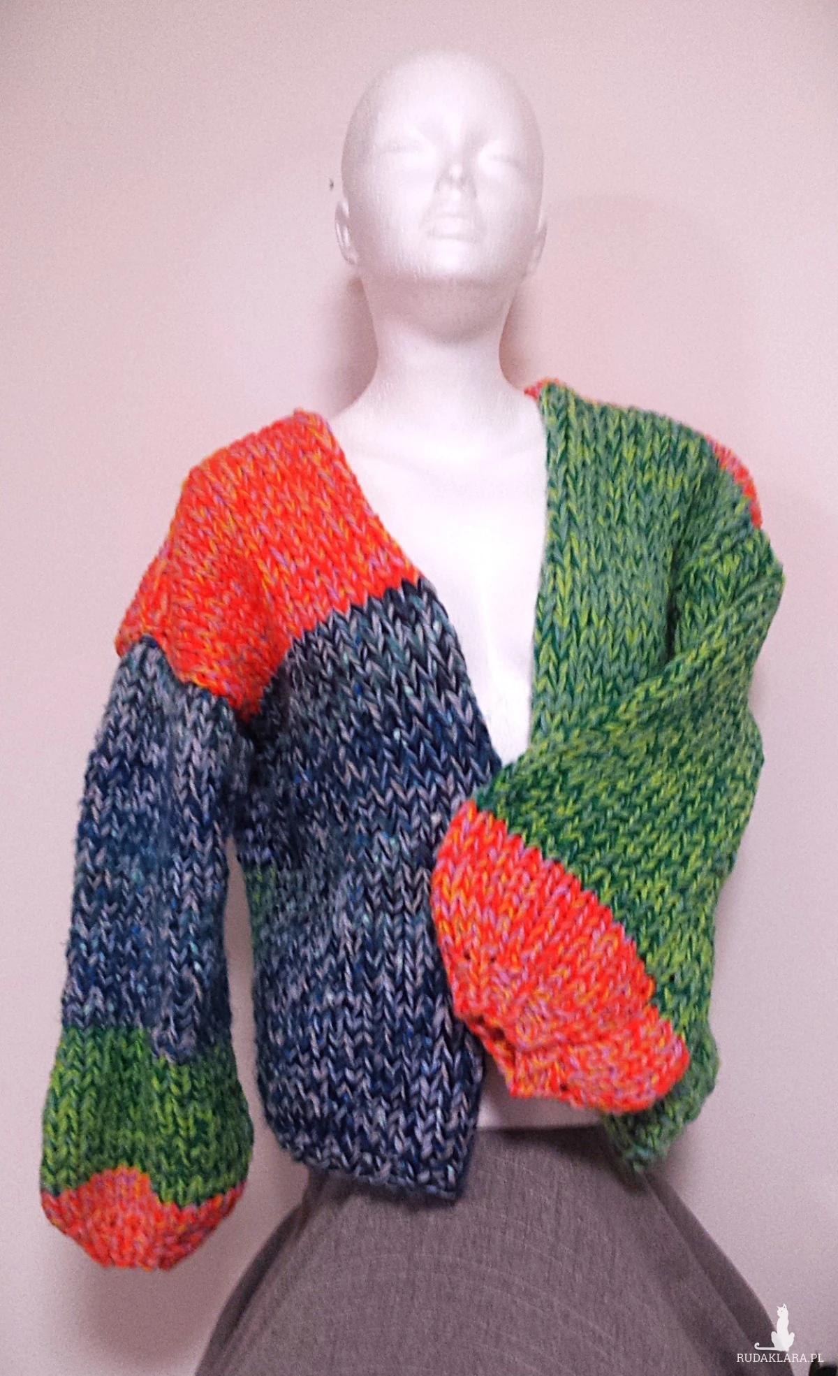 Oryginalny, praktyczny prezent dla Ciebie lub bliskiej osoby*** Kolorowy, krótki kardigan. Bardzo ciepły, robiony z poczwórnej miękkiej włóczki akrylowej. Rozmiar uniwersalny (36-40). Możliwość wykonania w różnych wersjach kolorystycznych i rozmiarach, na zamówienie (czas wykonania 10 dni). Inne fasony na pozostałych moich aukcjach.