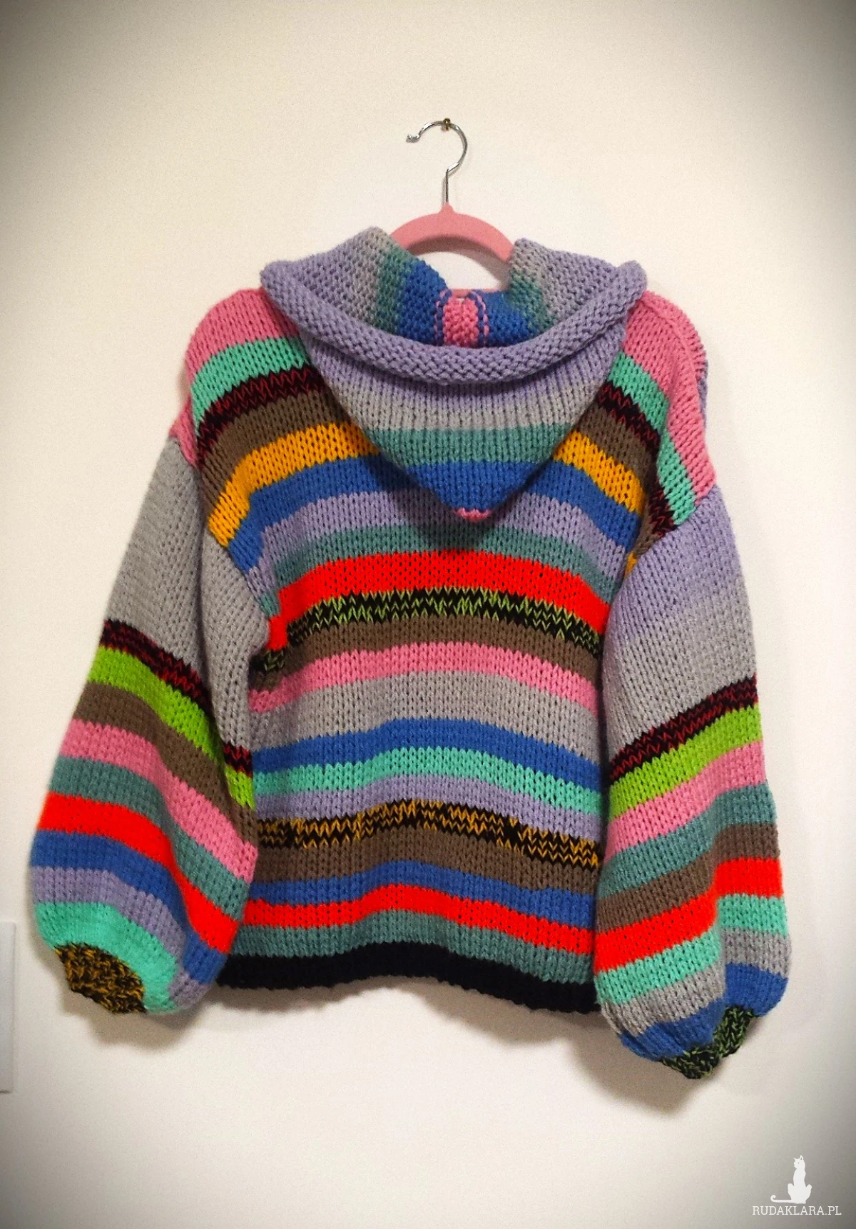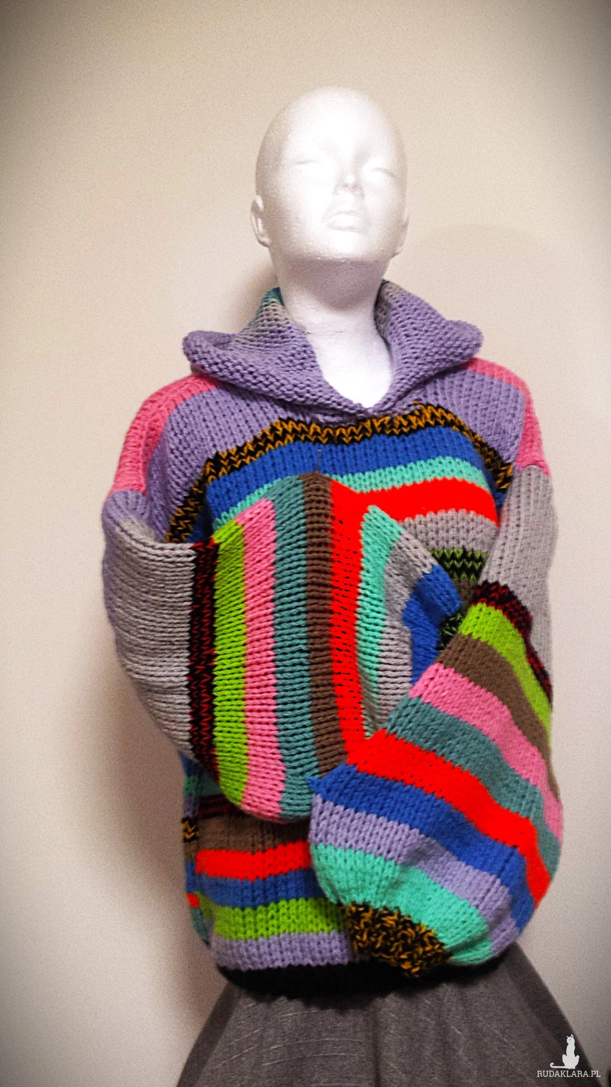 Oryginalny, praktyczny prezent dla Ciebie lub bliskiej osoby*** Ciepły kolorowy sweter z kapturem, typu oversize, wykony na drutach - z podwójnie robionej miękkiej włóczki akrylowej. Rozmiar uniwersalny (36-42). Możliwość wykonania w różnych wersjach kolorystycznych i rozmiarach, na zamówienie (czas wykonania 10 dni). Inne fasony na pozostałych moich aukcjach.