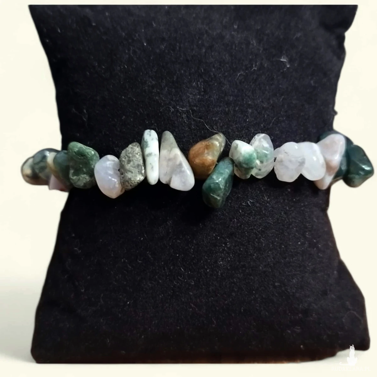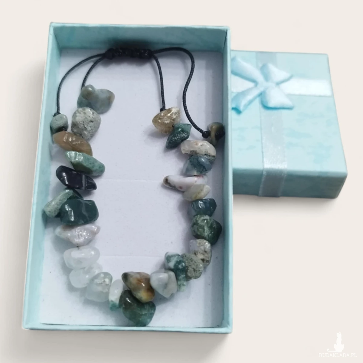 Bransoletka z naturalnych kamieni agatu indyjskiego to elegancka i wyjątkowa biżuteria. Nieregularny kształt kamieni oraz niezwykłe barwy ziemi - od białokremowej poprzez różne odcienie zieleni dodają jej uroku i tworzą z niej ciekawą i oryginalną ozdobę.