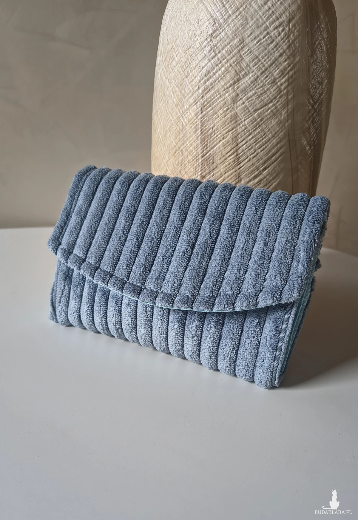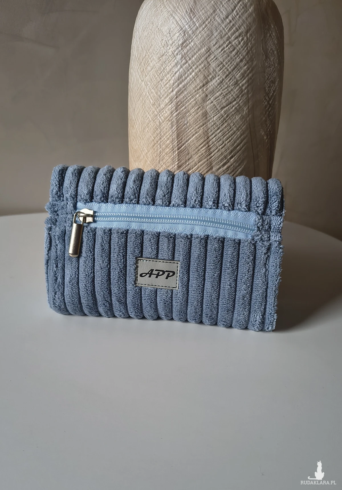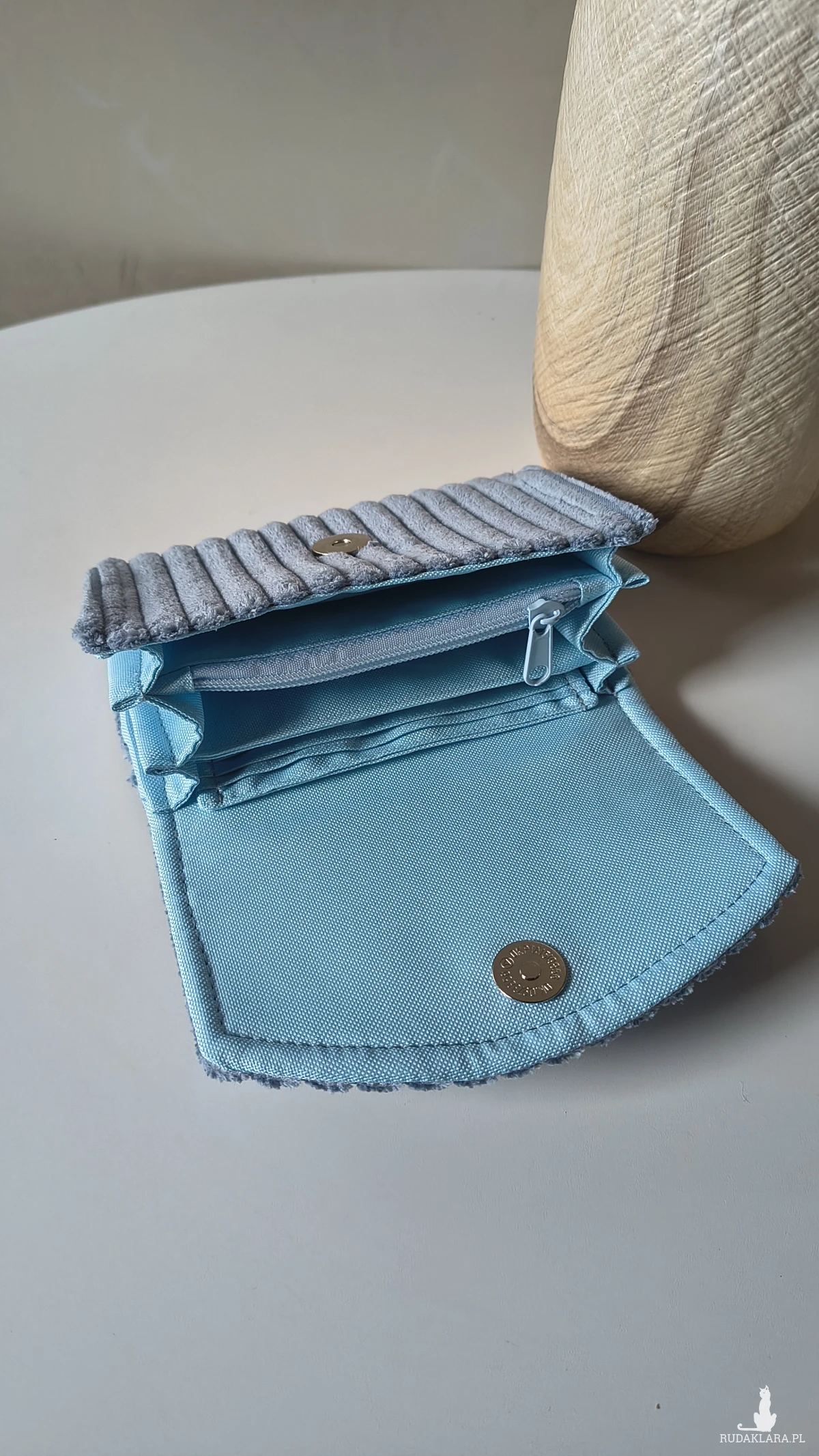 Przedstawiam portfel w kolorze niebieskim. Wykonany ze sztruksu.