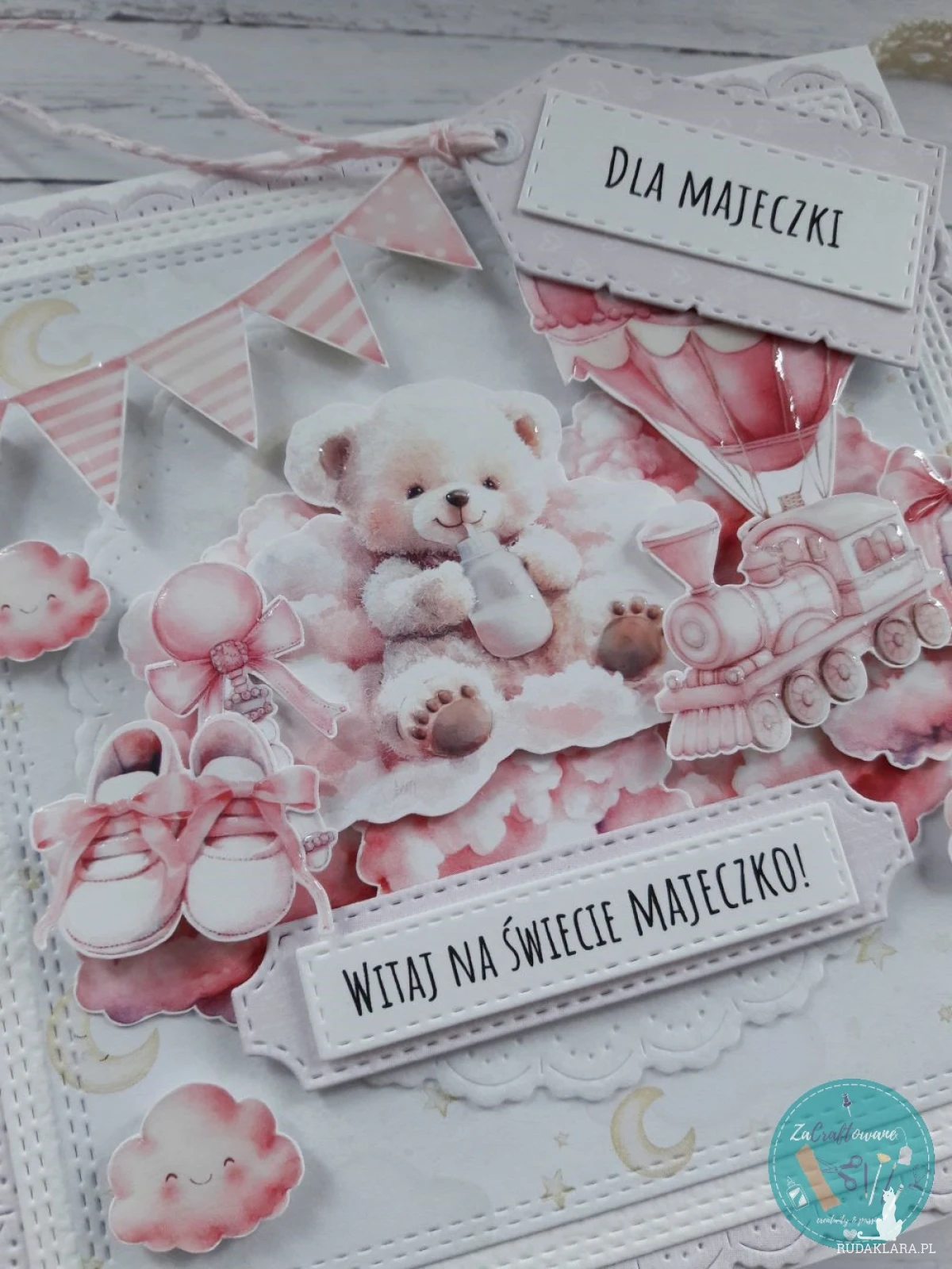 Kartka z okazji narodzin dziewczynki, której motywem przewodnim jest uroczy misiu leżący na chmurce w otoczeniu wesołych chmurek, zabawek i innych elementów.