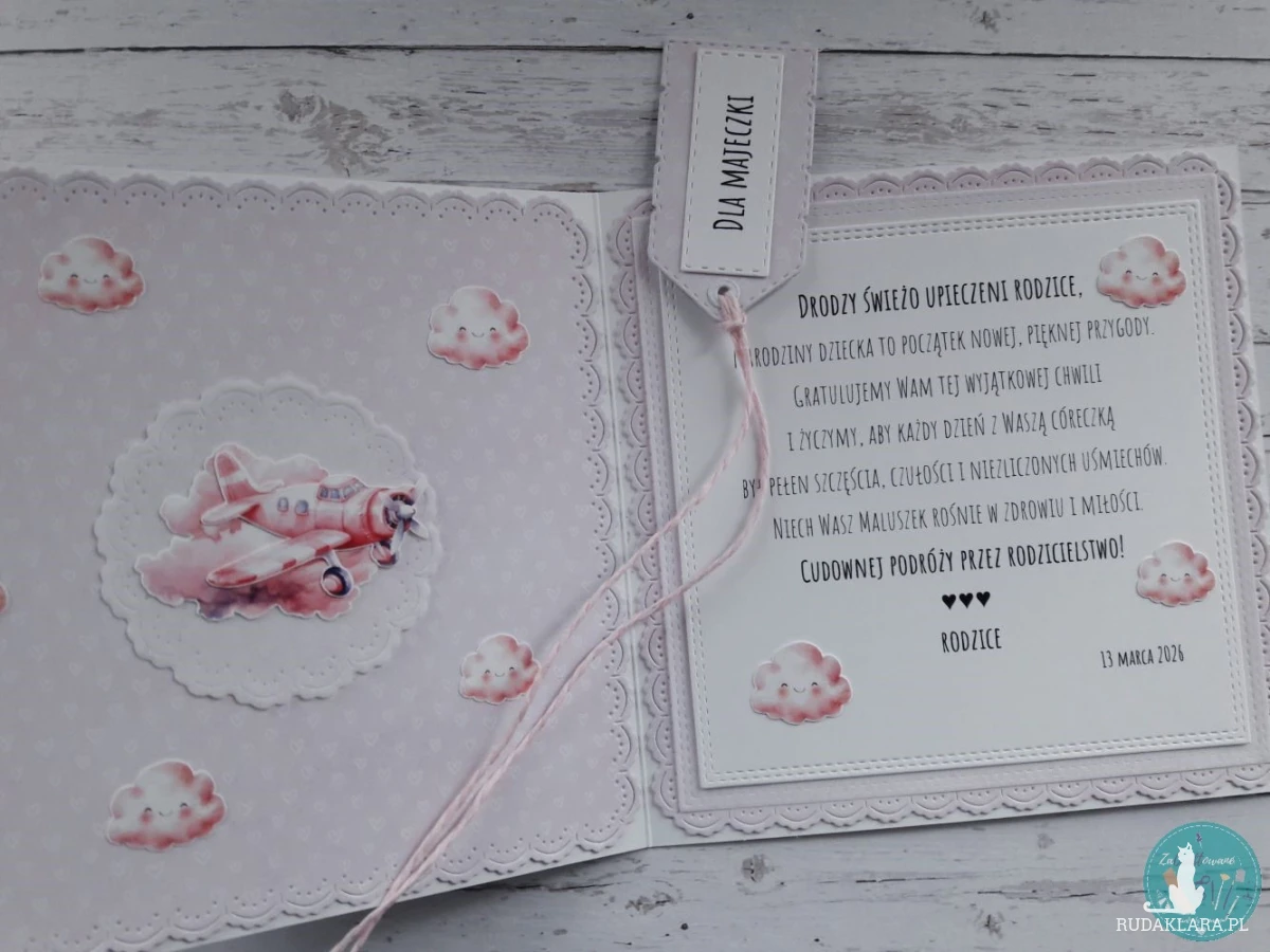 Życzenia z okazji narodzin córeczki, wypisane na tej unikatowej, ręcznie robionej kartce, z pewnością sprawią radość świeżo upieczonym rodzicom i będą piękną pamiątką tego wyjątkowego dnia.