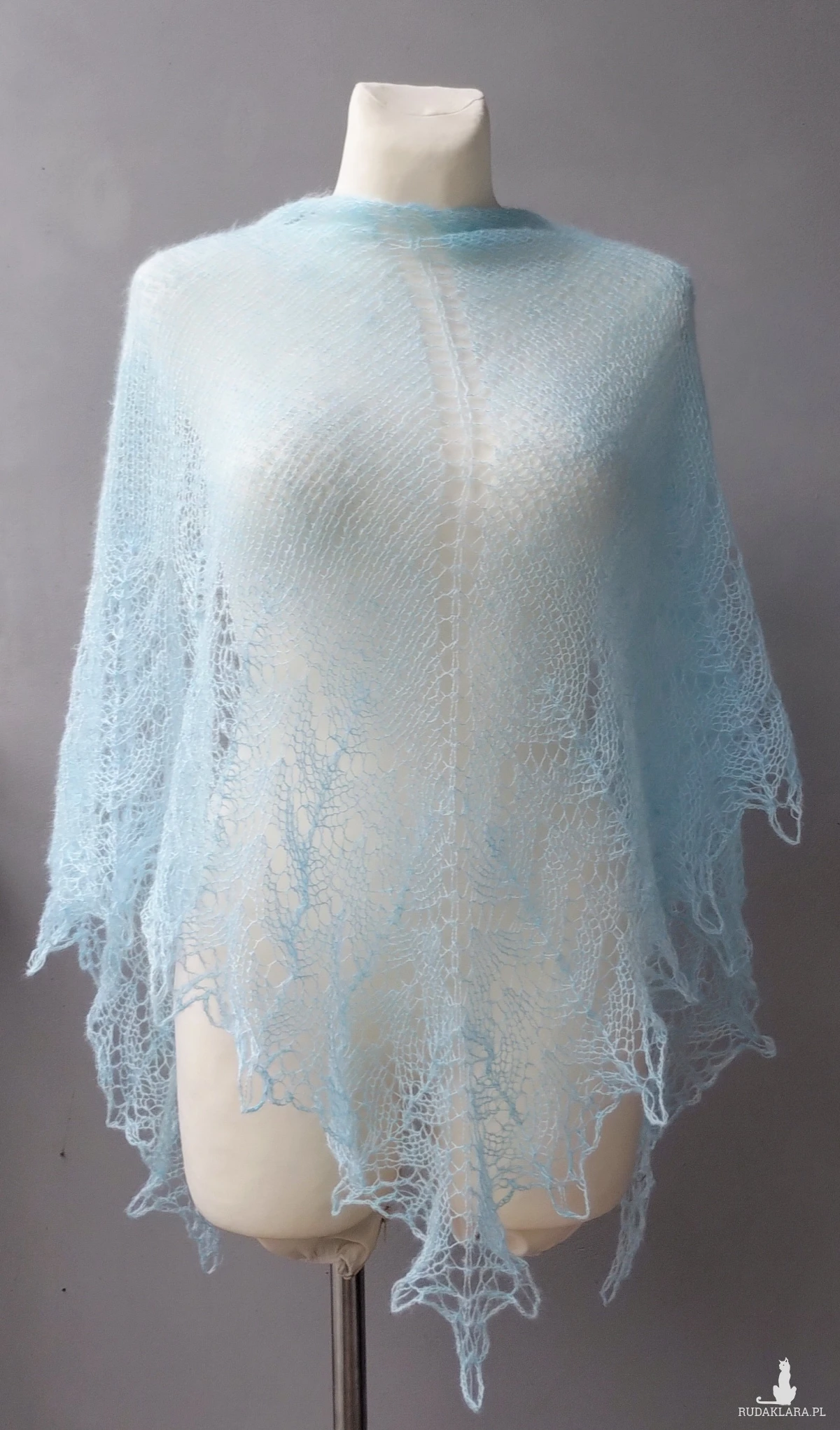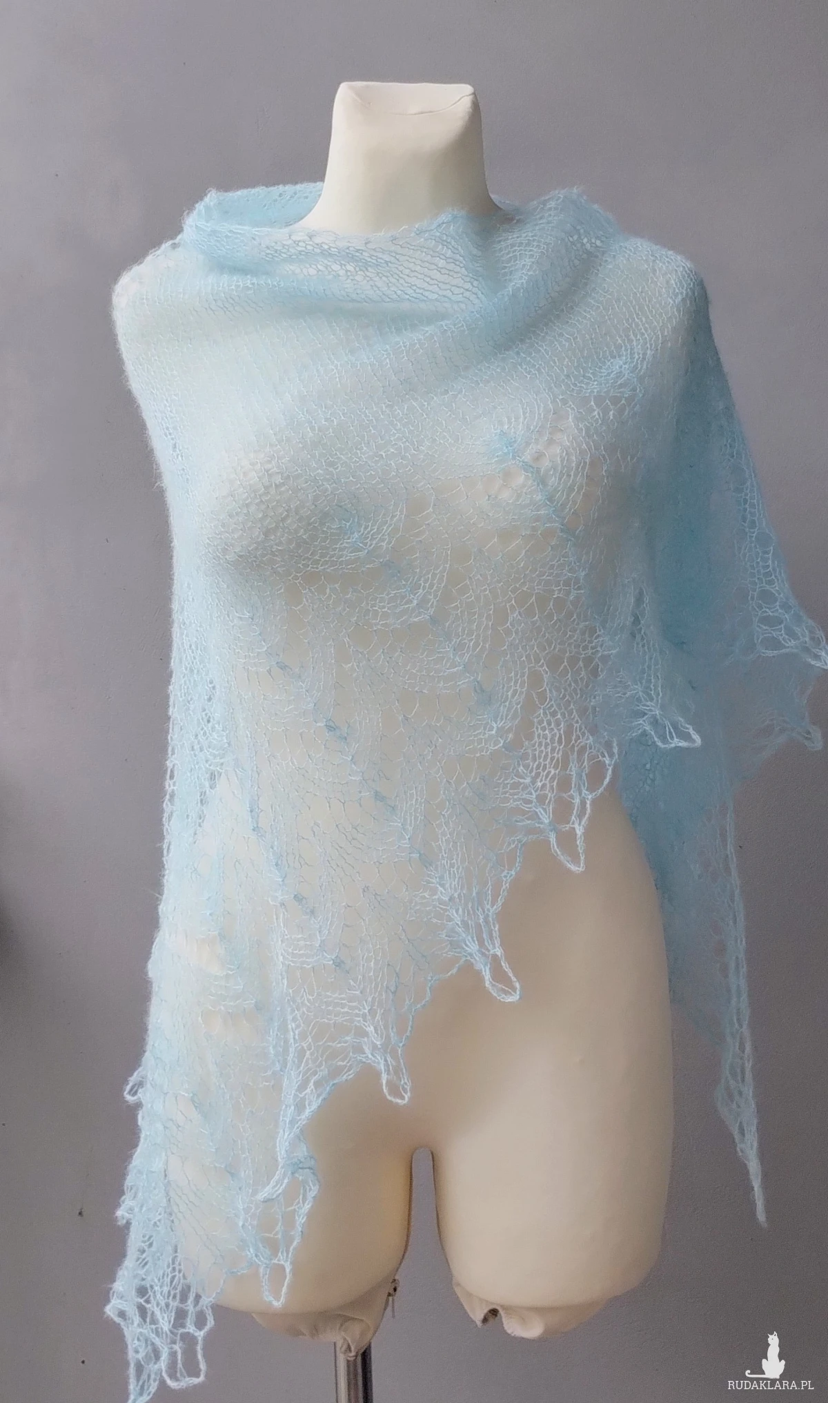 z mieszanki wełny, moheru i akrylu w kolorze jasnego błękitu. Chusta mgiełka.Wymiary: szerokość 200 cm, długość 95 cm. Prać ręcznie w temperaturze 30 stopni, suszyć na leżąco .